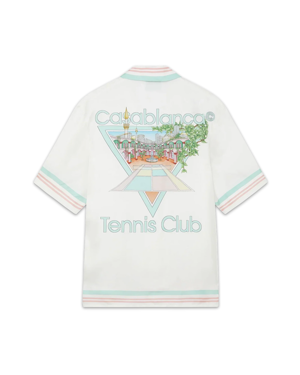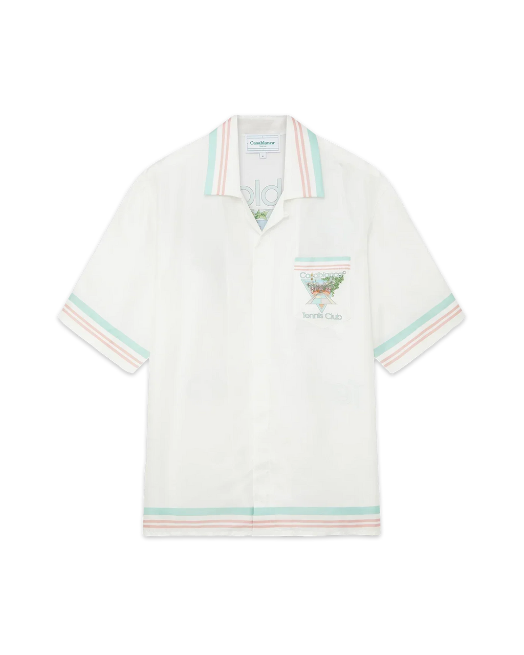 The Tennis Club Icon pastelle silk shirt features the house's signature artwork reinterpreted for this season. Finished with a Cuban collar intended to be worn open with front button closure and has been designed for a relaxed fit.