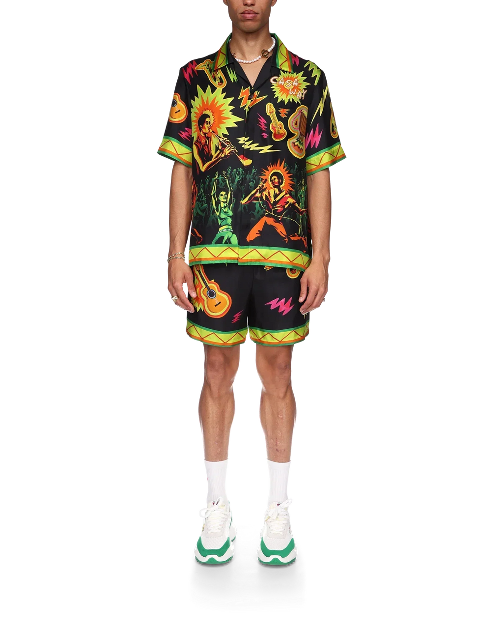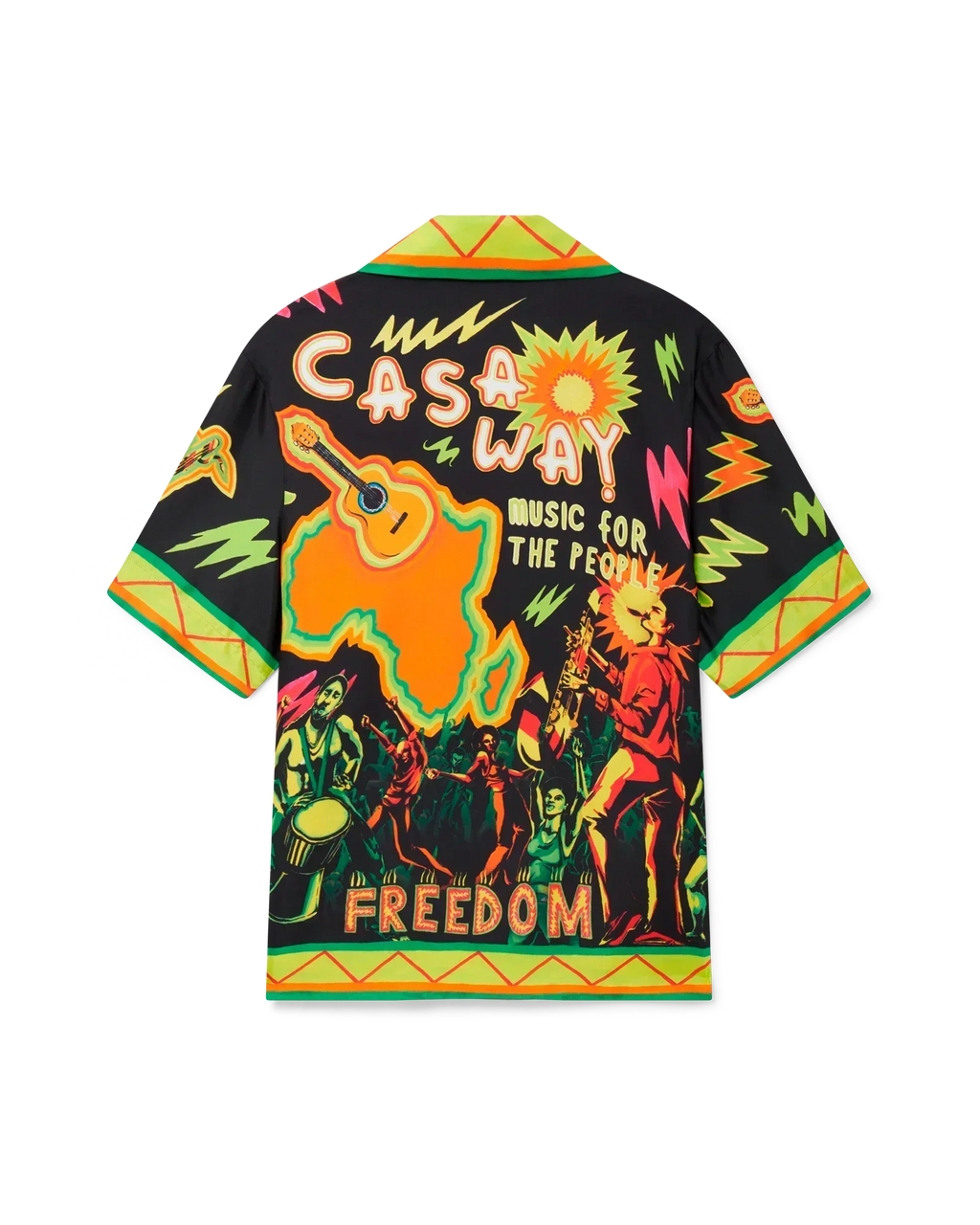 The Music For The People silk shirt is a short-sleeve printed design crafted from a printed silk twill fabric, featuring the house's seasonal artwork inspired by the youth of Nigeria; their want to party through adversity, how music heals people and vintage vinyl covers from the '70s. Complete with a Cuban collar, and contrast detail collar, cuffs and hem.