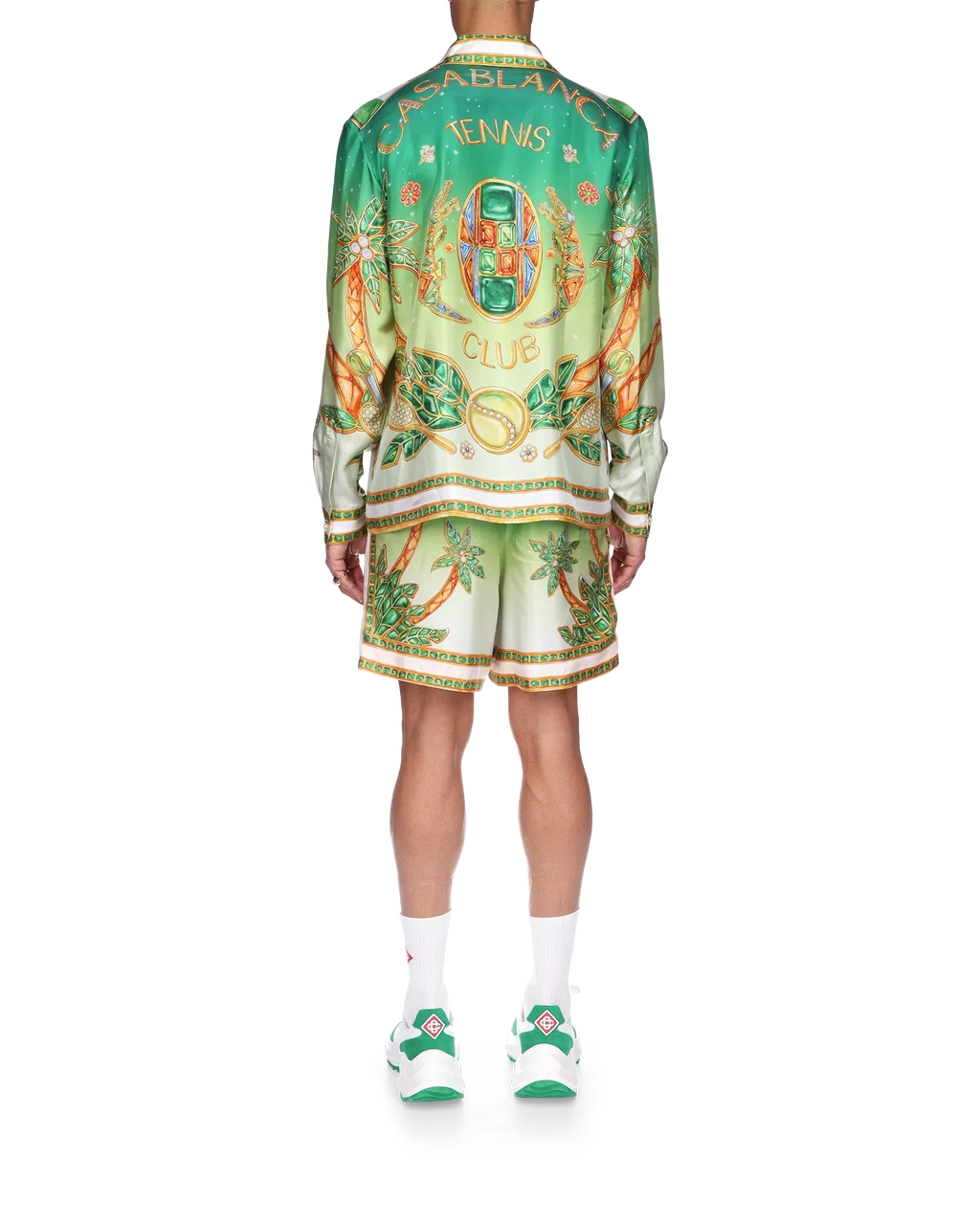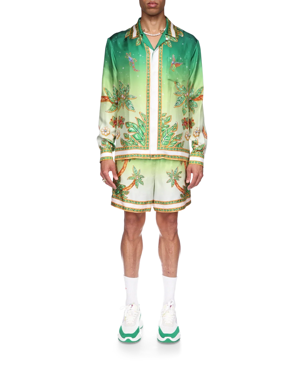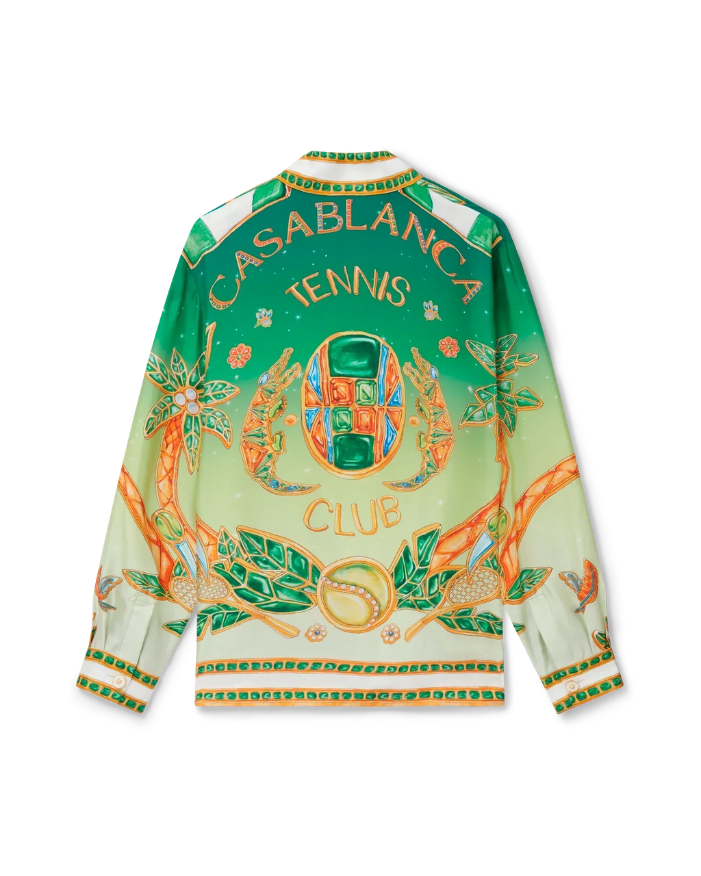 The Joyaux D’Afrique silk shirt is a long-sleeve all-over printed style featuring seasonal artwork incorporating nature references from Nigeria and the house's jewellery designs blended with our traditional tennis club layout. Crafted from a silk twill fabric with a cuban collar, button closure, and gold rim enamel buttons.