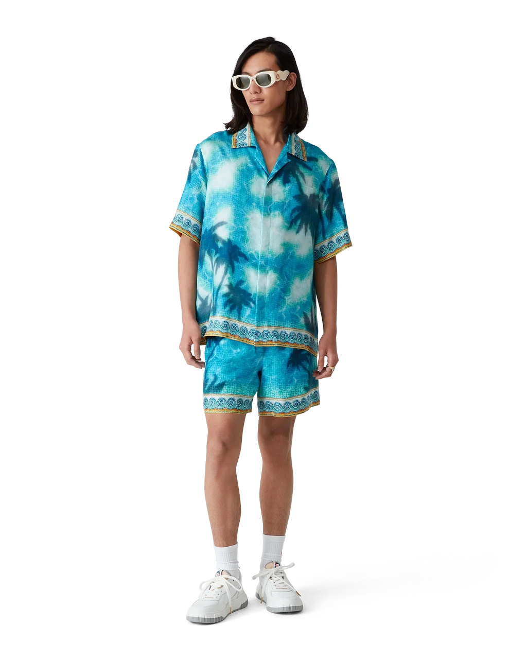 The Poolside Emblem silk shirt is an all-over printed design featuring hand-painted scenes created especially for the collection and crafted from silk twill fabric. Completed with front button closure, interlocking CC logo corozo buttons, a breast pocket, a Cuban collar, and Greek-mosaic-inspired edge detail on the collar, cuffs, and hem.
