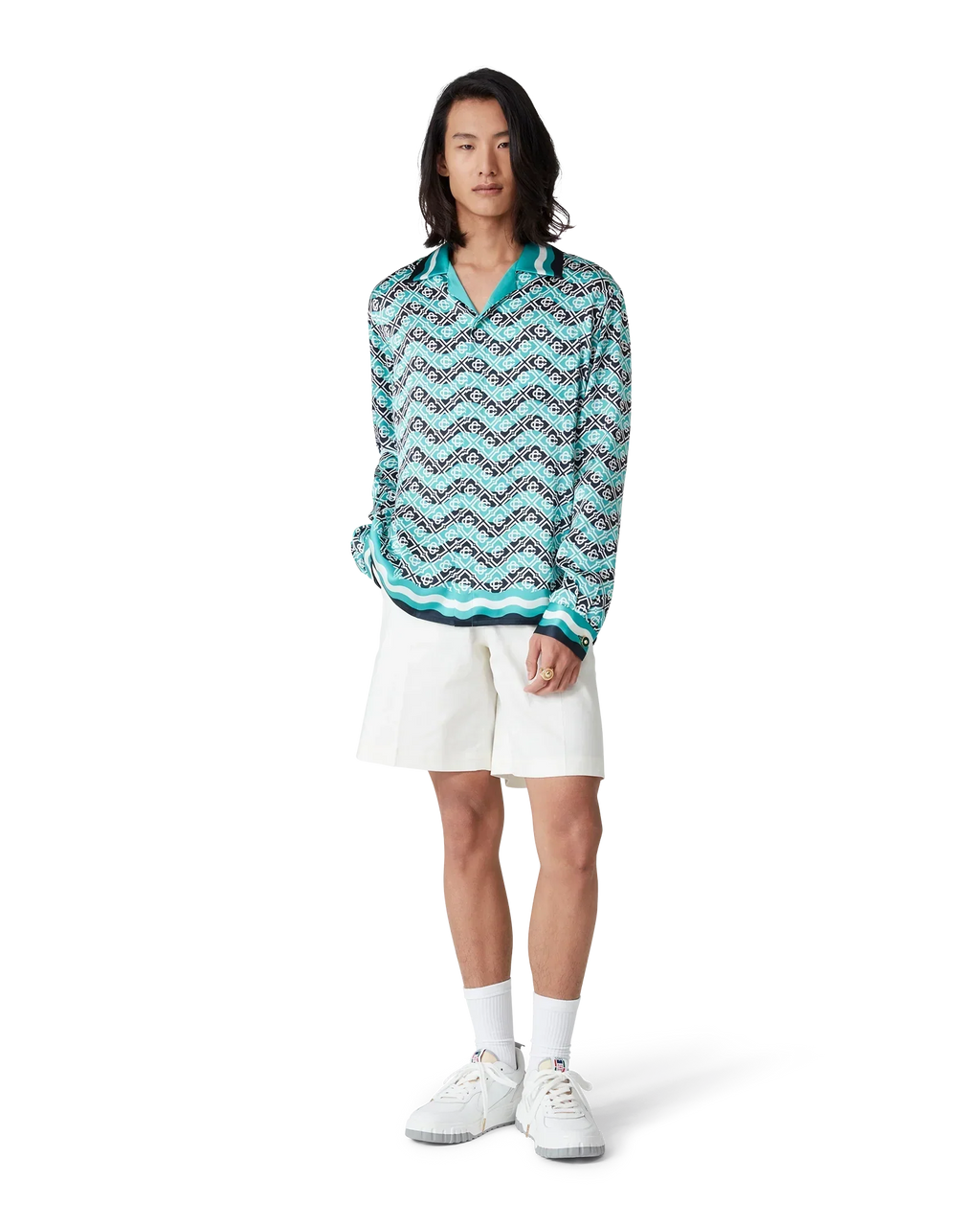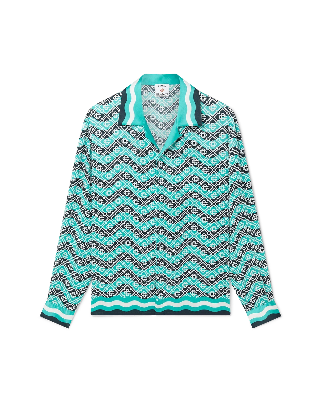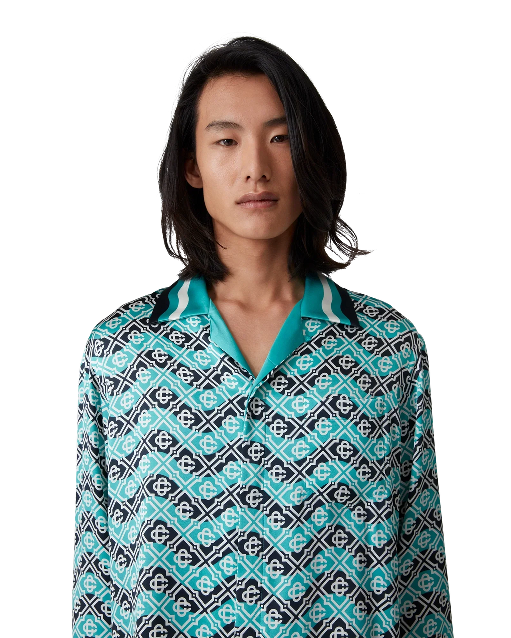 The Monogram Wave silk shirt is an all-over printed style in the house's signature monogram crafted from a silk satin fabric. Completed with front button closure with interlocking CC corozo buttons, gold rim enamel buttons on the cuffs, a Cuban collar, and Memphis-wave-inspired stripe detail in the collar, cuffs, and hem.