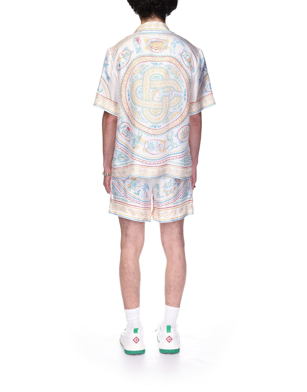 The Crayon Vase silk shirt is a multicoloured printed design crafted from a silk twill fabric, featuring seasonal artwork inspired by a classic Greek plate layout with the house's design codes. Completed with a Cuban collar, button closure, signature CC logo corozo buttons, the season's Greek wave and stripe edge detail on the collar, cuffs and hem.