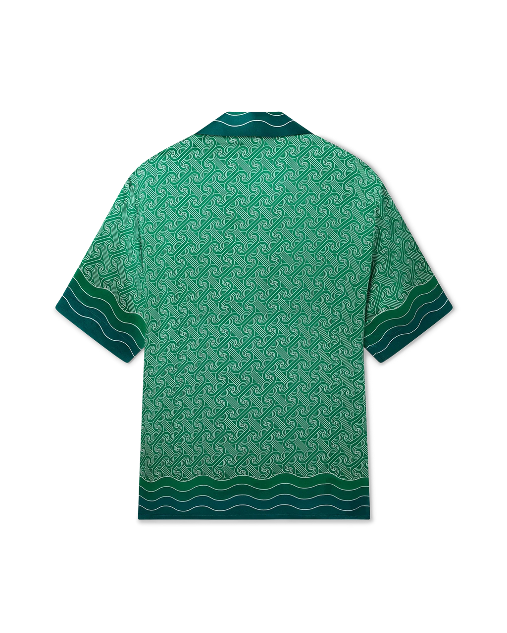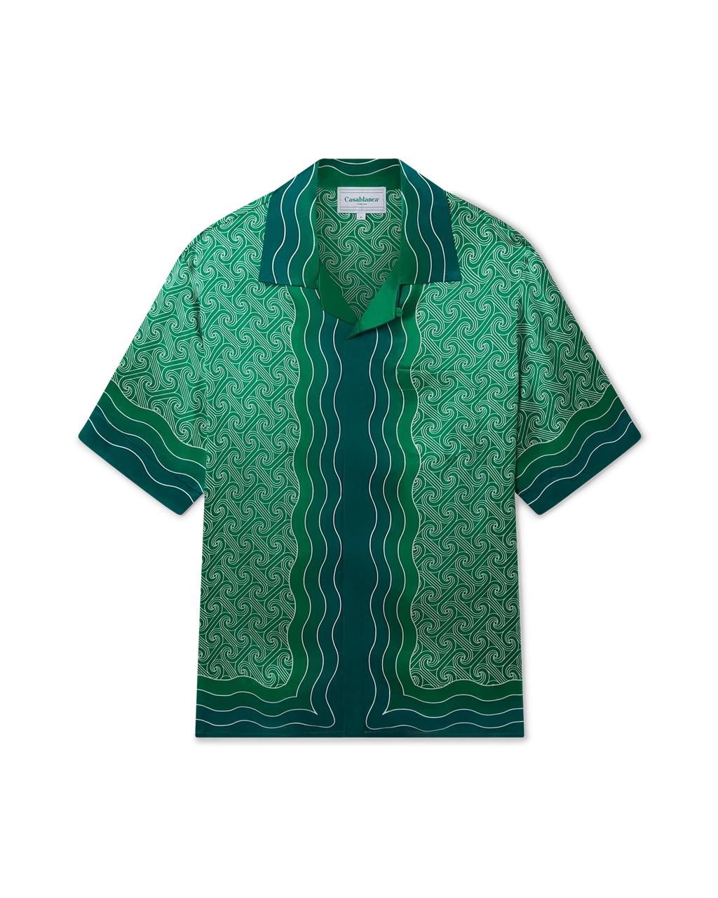 The Column Monogram silk shirt is a short-sleeve all-over printed design featuring the house's seasonal Greek-inspired column monogram, crafted from a silk satin fabric. Completed with a Cuban collar, button closure with signature CC logo corozo buttons, a chest pocket, and Memphis wave-inspired gradient stripe detail on the collar, cuffs, hem and placket.