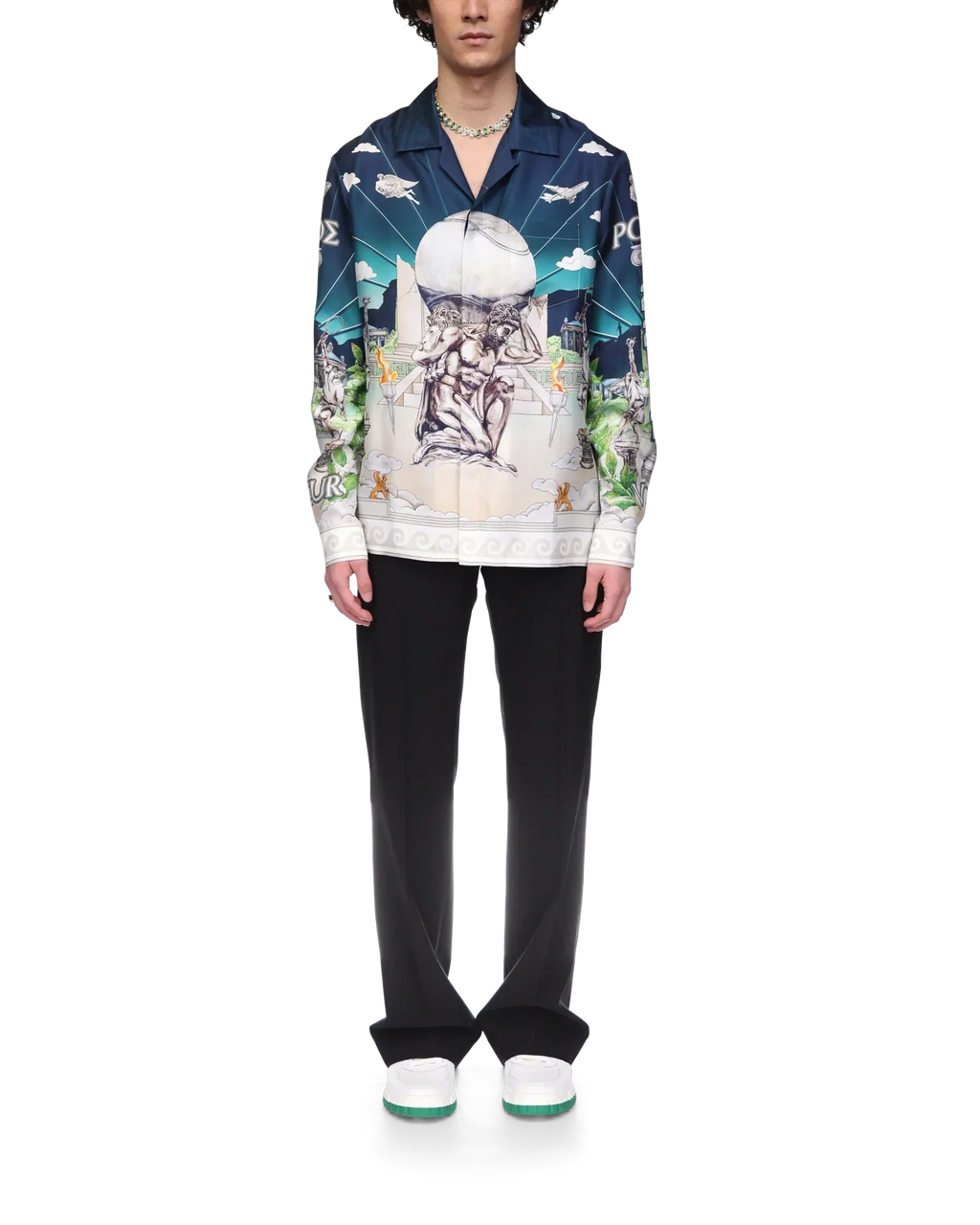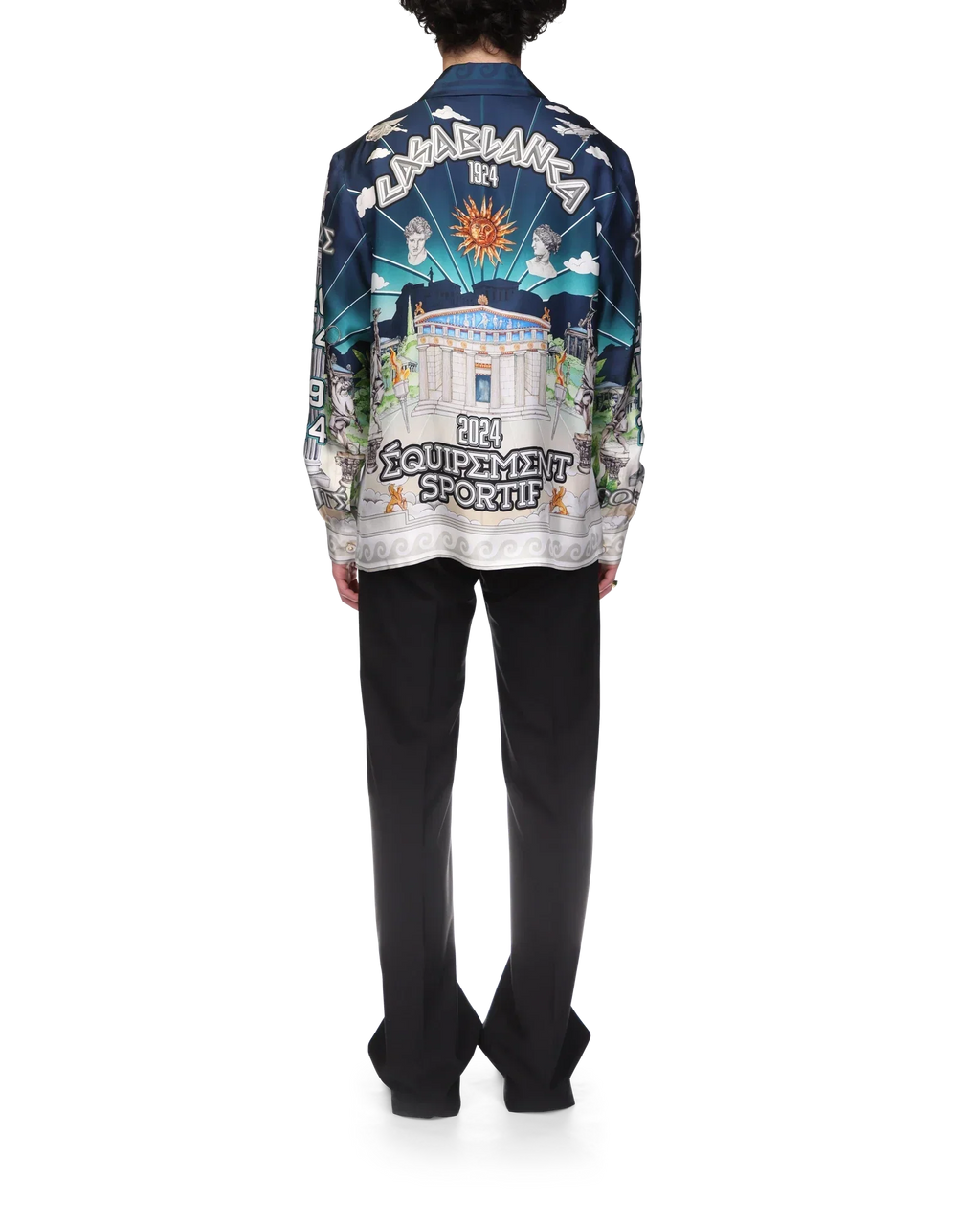 The Le Temple du Sport silk shirt is a long-sleeve all-over printed design and is part of the exclusive collaboration with Jeff Hamilton - it's a take on our tennis club with a landscape and floating elements - crafted from a silk twill fabric. Completed with the house's signature gold-rim pearl buttons, button closure, a Cuban collar, and this season's Greek-wave-inspired edge detail on the collar, cuffs, and hem.