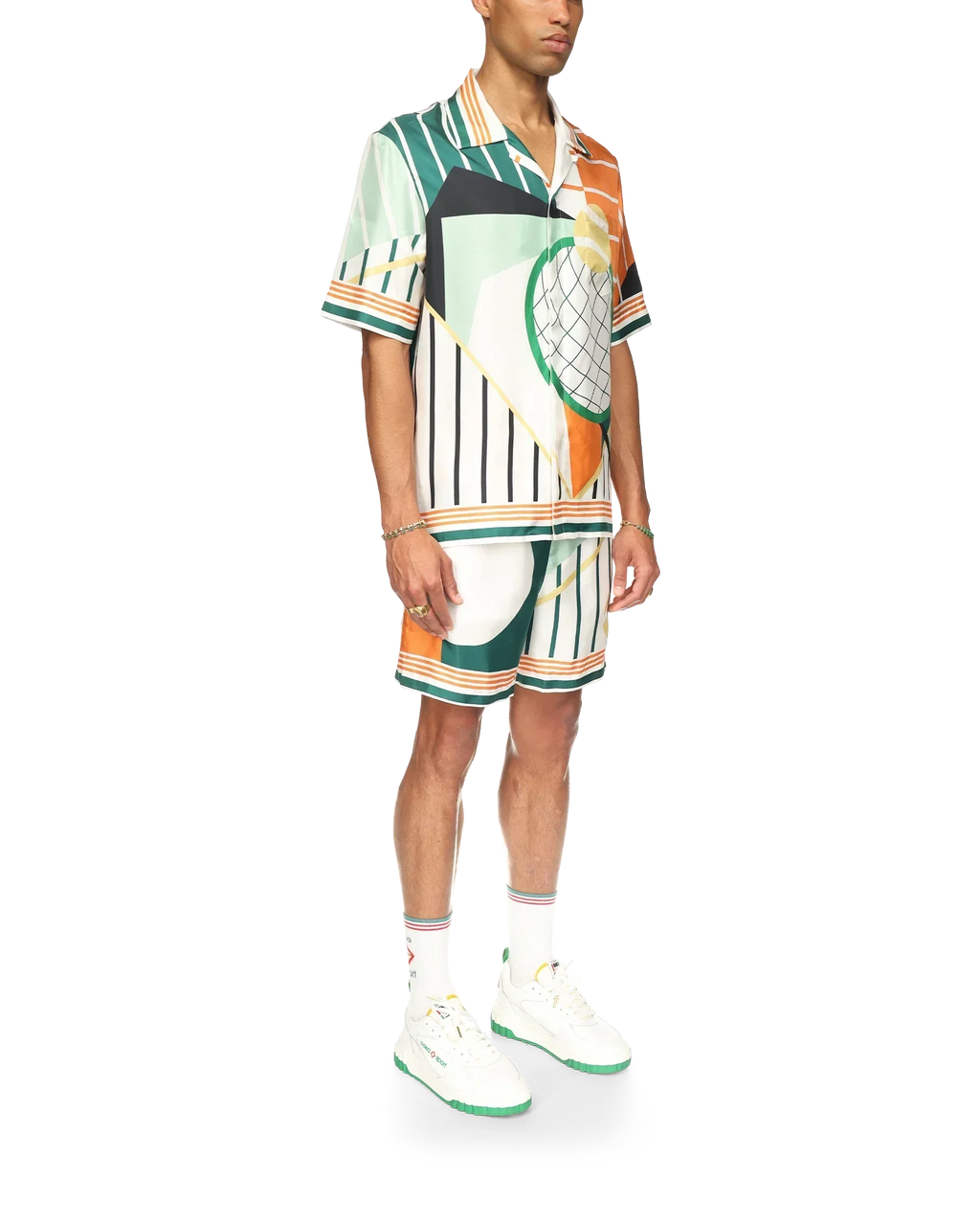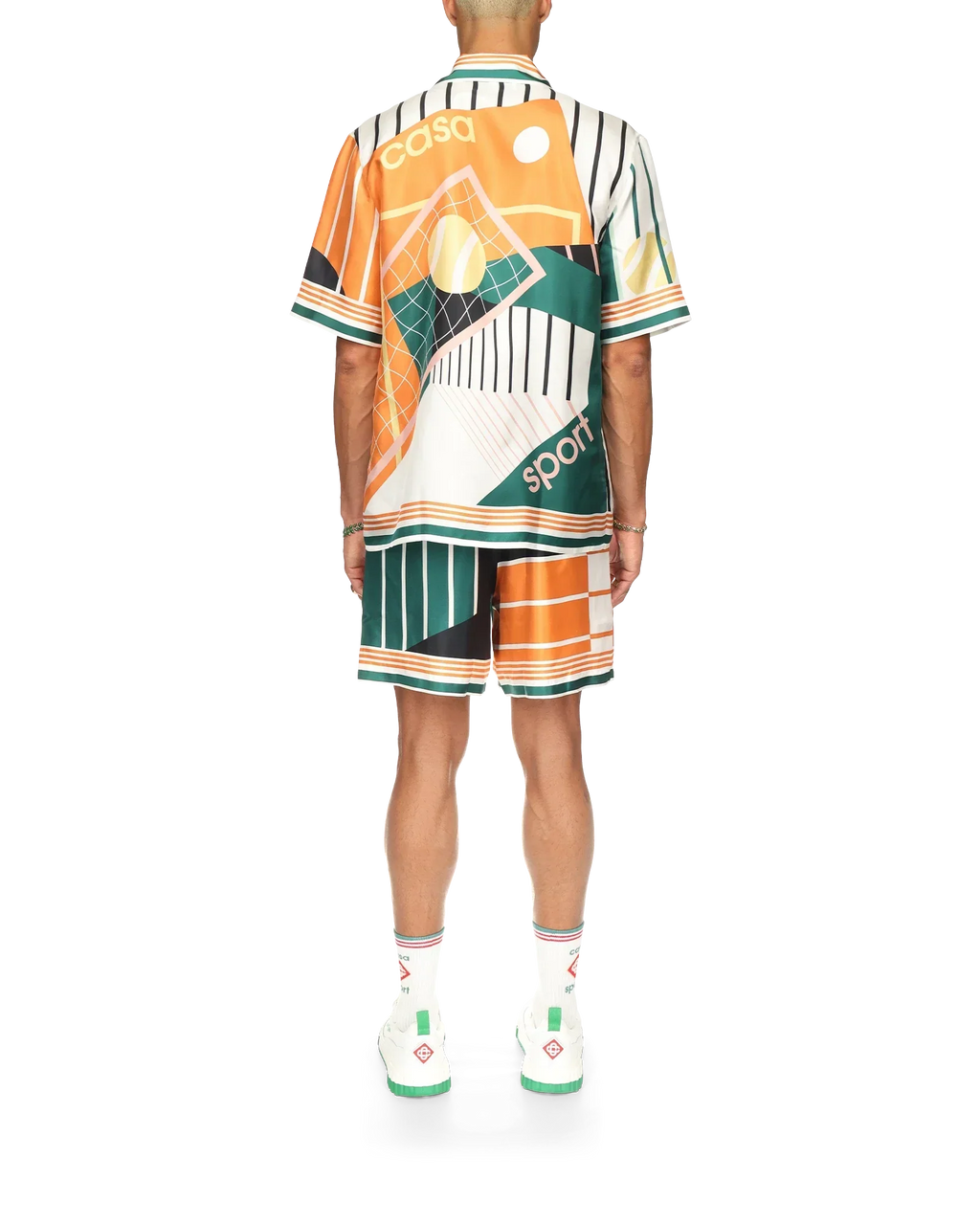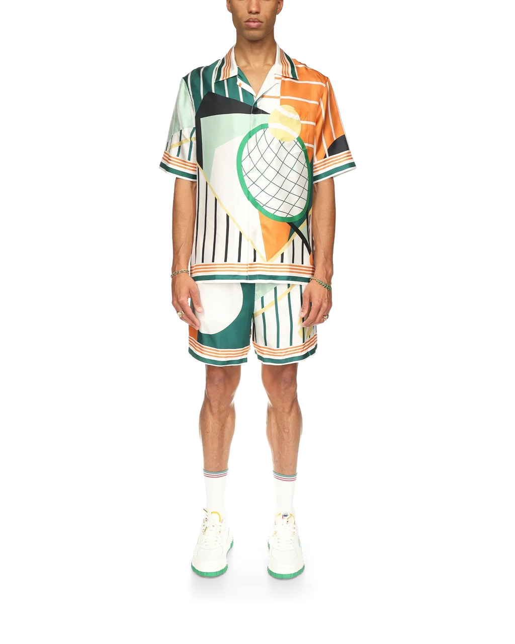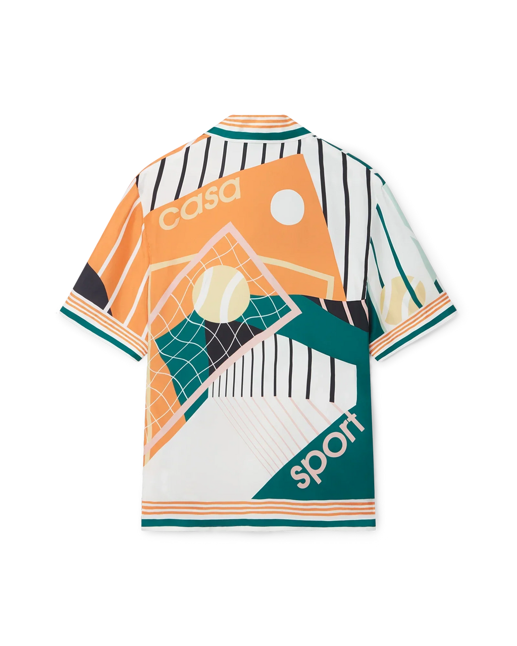 The Court Abstrait silk shirt is a short-sleeve all-over print design featuring the house's classic iconography artwork of tennis equipment. Finished with stripe detailing on the collar, cuffs and hem, button closure and Casablanca branded label - designed for a classic Fits.