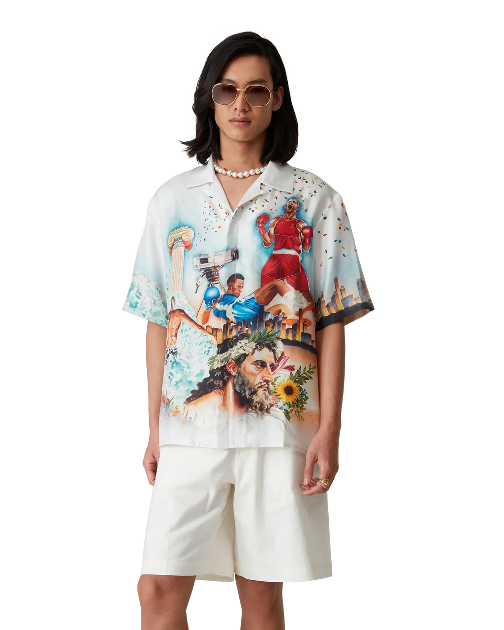 The Celebration Du Sport silk shirt is a short-sleeved all-over printed design crafted from a silk twill fabric featuring seasonal artwork inspired by the house's play on a classic movie poster layout with our own characters in that world. Completed with signature interlocking CC logo corozo buttons, hidden button closure, a breast pocket, and a Cuban collar.
