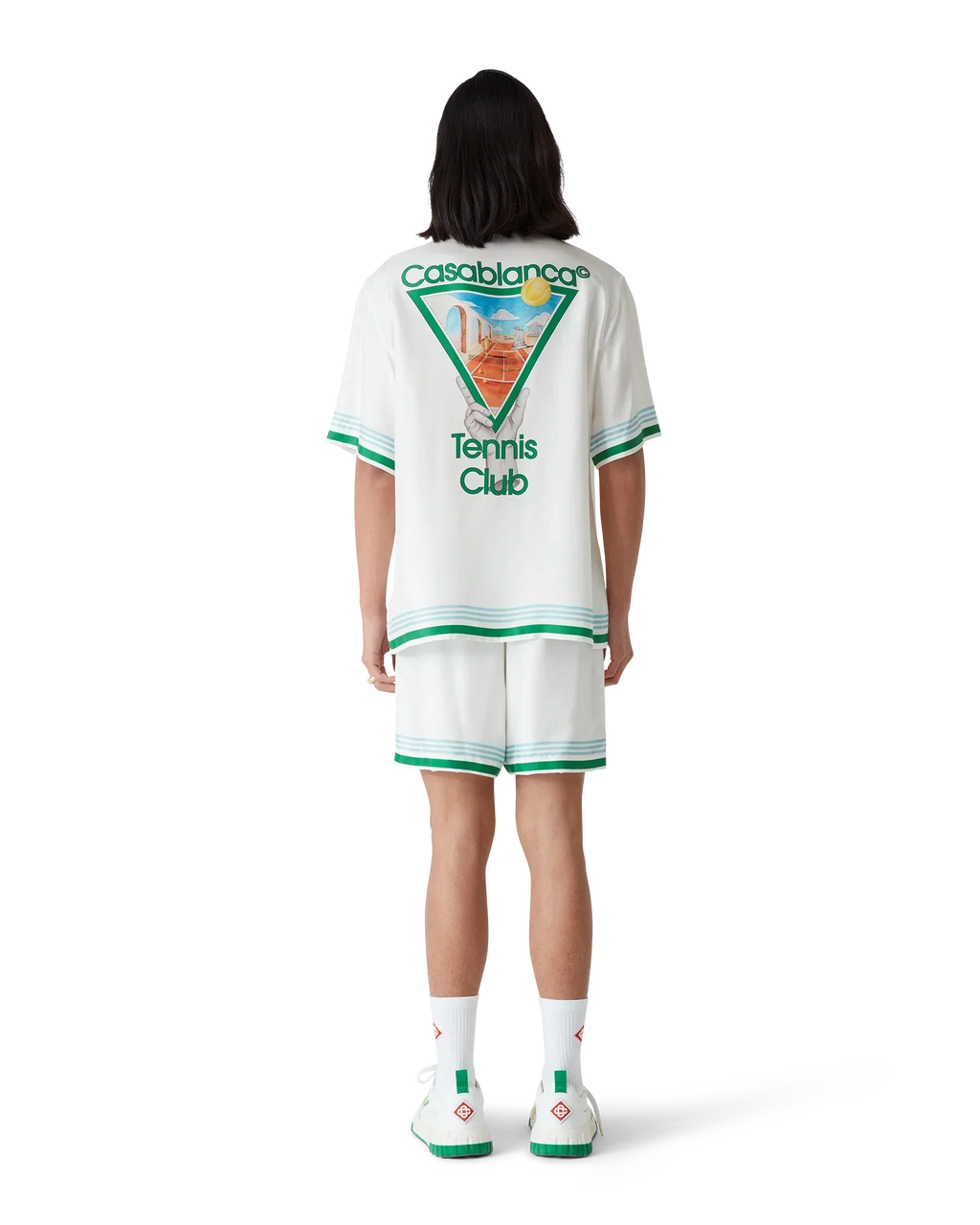 The Metaphysical Tennis Icon silk shirt is a short-sleeved design crafted from a silk twill fabric featuring the house's seasonal artwork, inspired by the continued study of the classical beauty and contemporary allure of Ancient Greece, incorporating the house's design elements of tennis, nature and architecture. Completed with signature interlocking CC logo corozo buttons, hidden button closure, a Cuban collar, a breast pocket, and blue, white and green stripe detail on the cuffs, collar and hem.