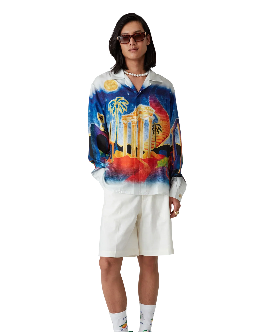 The Midnight Acropolis silk shirt is a long-sleeve all-over printed design crafted from silk twill fabric paying homage to the beautiful night of Ancient Greece with the beautiful light from the temple and sky. Completed with a Cuban collar, gold rim enamel buttons on the sleeves, and front button closure with interlocking CC branded corozo buttons.