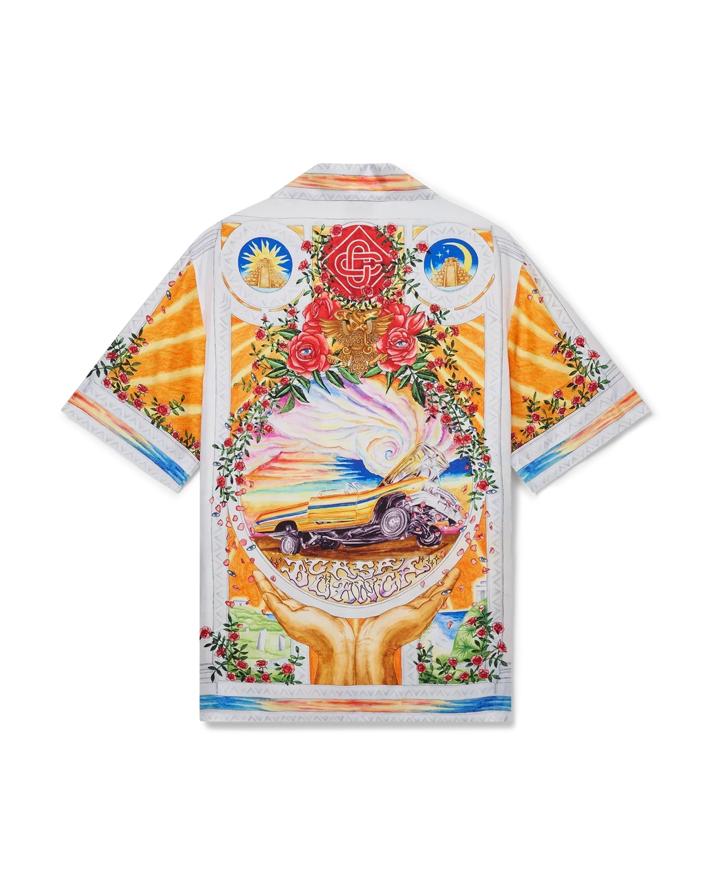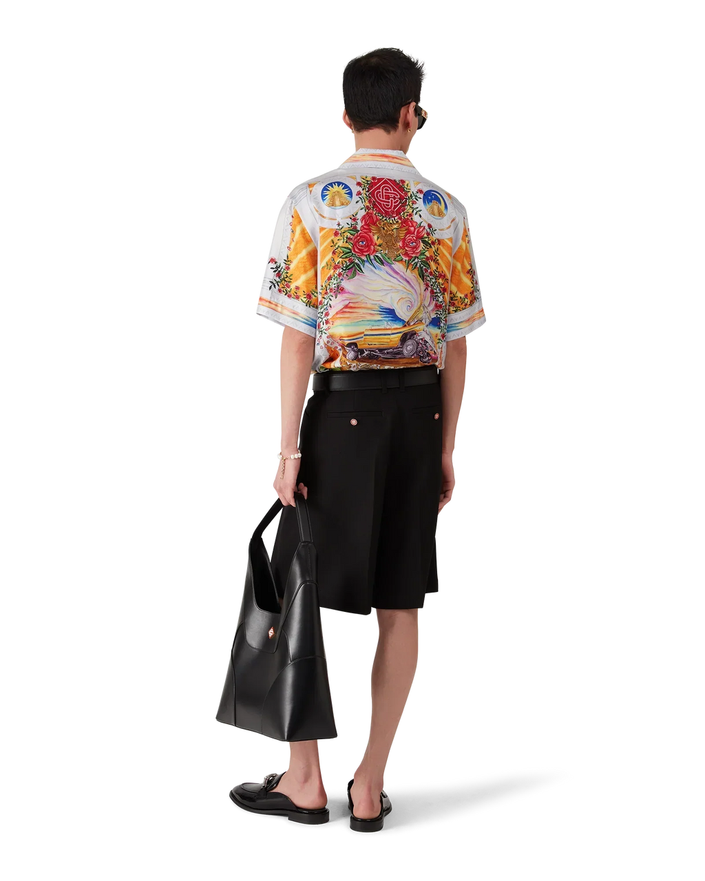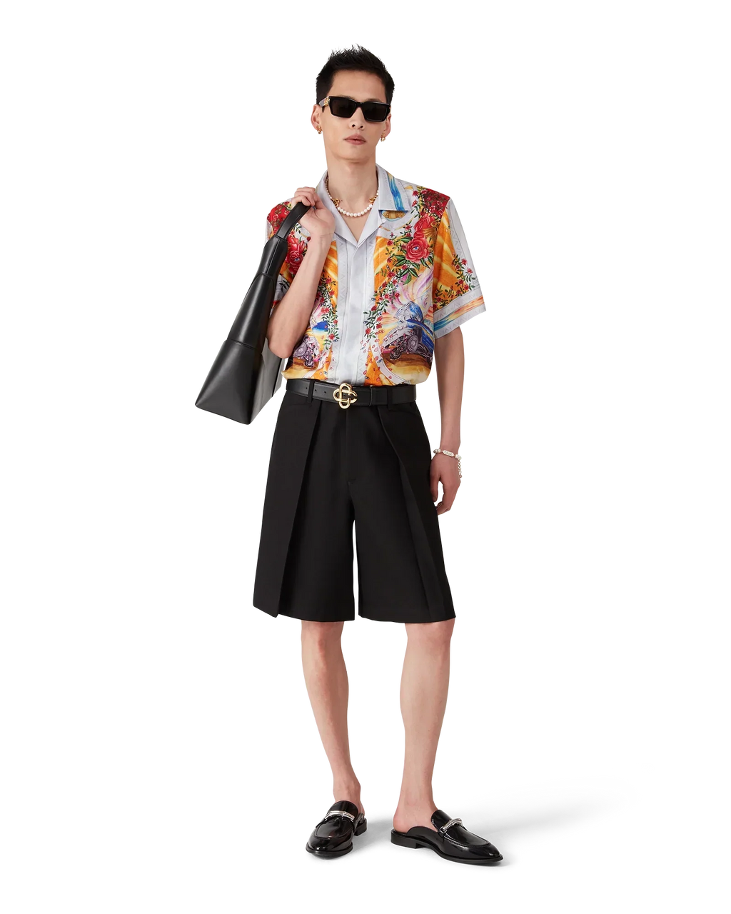 The La Tornade De Rose silk shirt is a short-sleeve printed design crafted from silk satin fabric. Completed with a Cuban collar, hidden button closure, interlocking CC logo corozo buttons, and edge detail on the collar, cuffs, hem and placket.