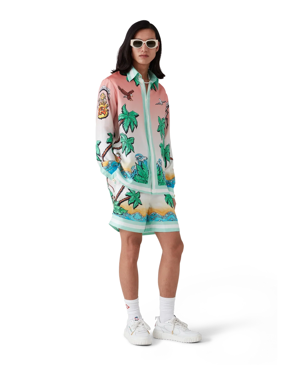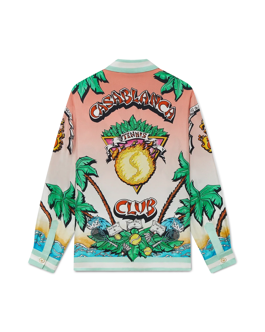 The Tennis Club silk shirt is an all-over printed design featuring artwork reinterpreting the house's Tennis Club print in a surf theme, in the style of a graphic sketch drawn with markers, crafted from silk twill fabric. Finished with a Cuban collar, a breast pocket, hidden button closure with interlocking CC corozo buttons, and a gold rim enamel button on each cuff.