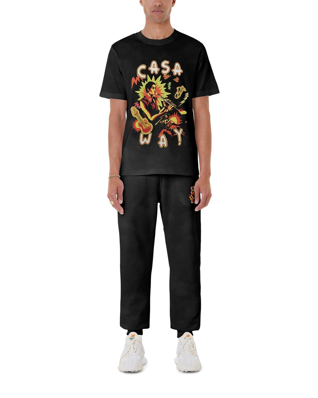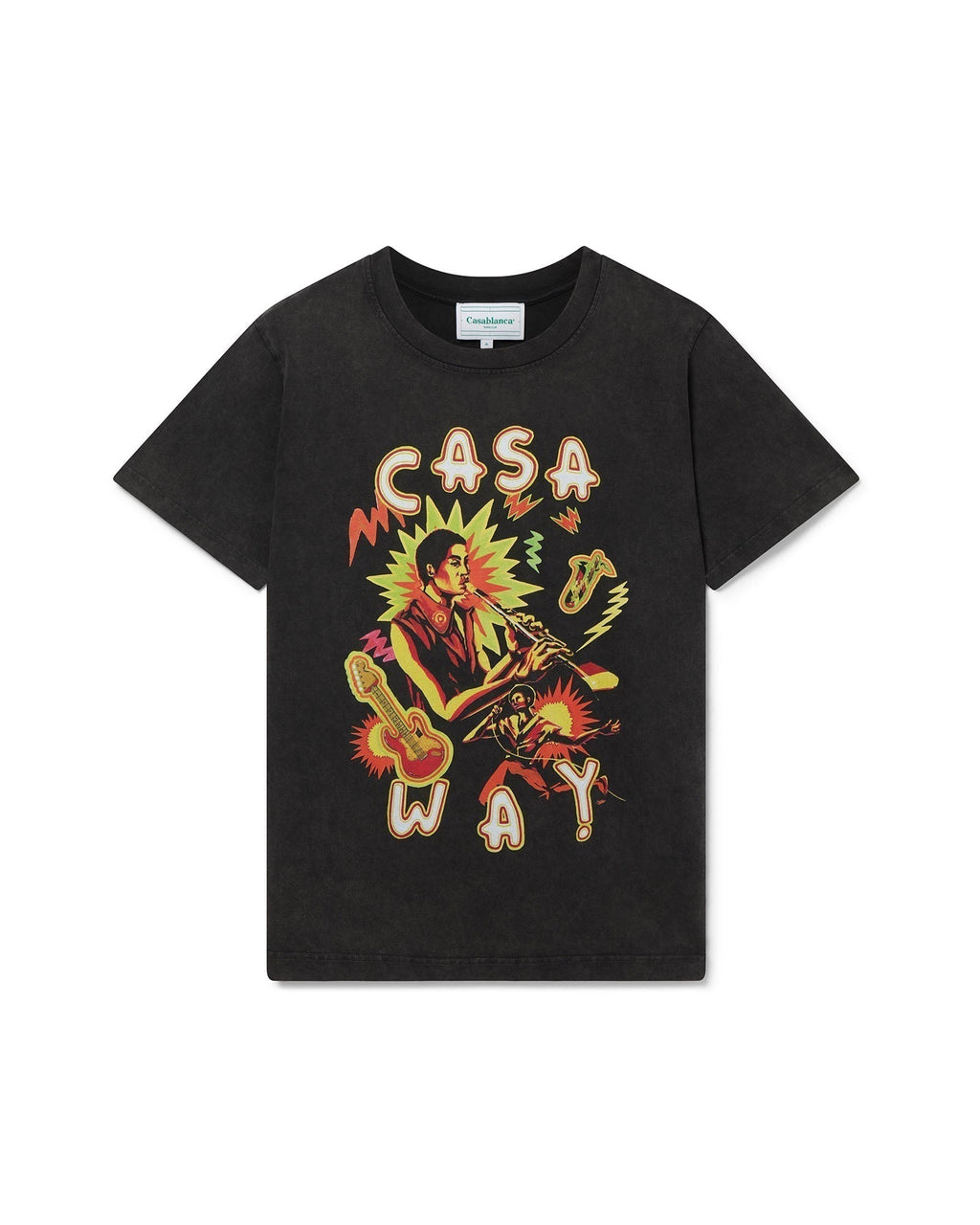 Le t-shirt Music For The People est un modèle imprimé à manches courtes confectionné dans un tissu en coton biologique noir délavé, présentant les œuvres d'art saisonnières de la maison. Complet avec un col rond classique et une étiquette de la marque Casablanca.