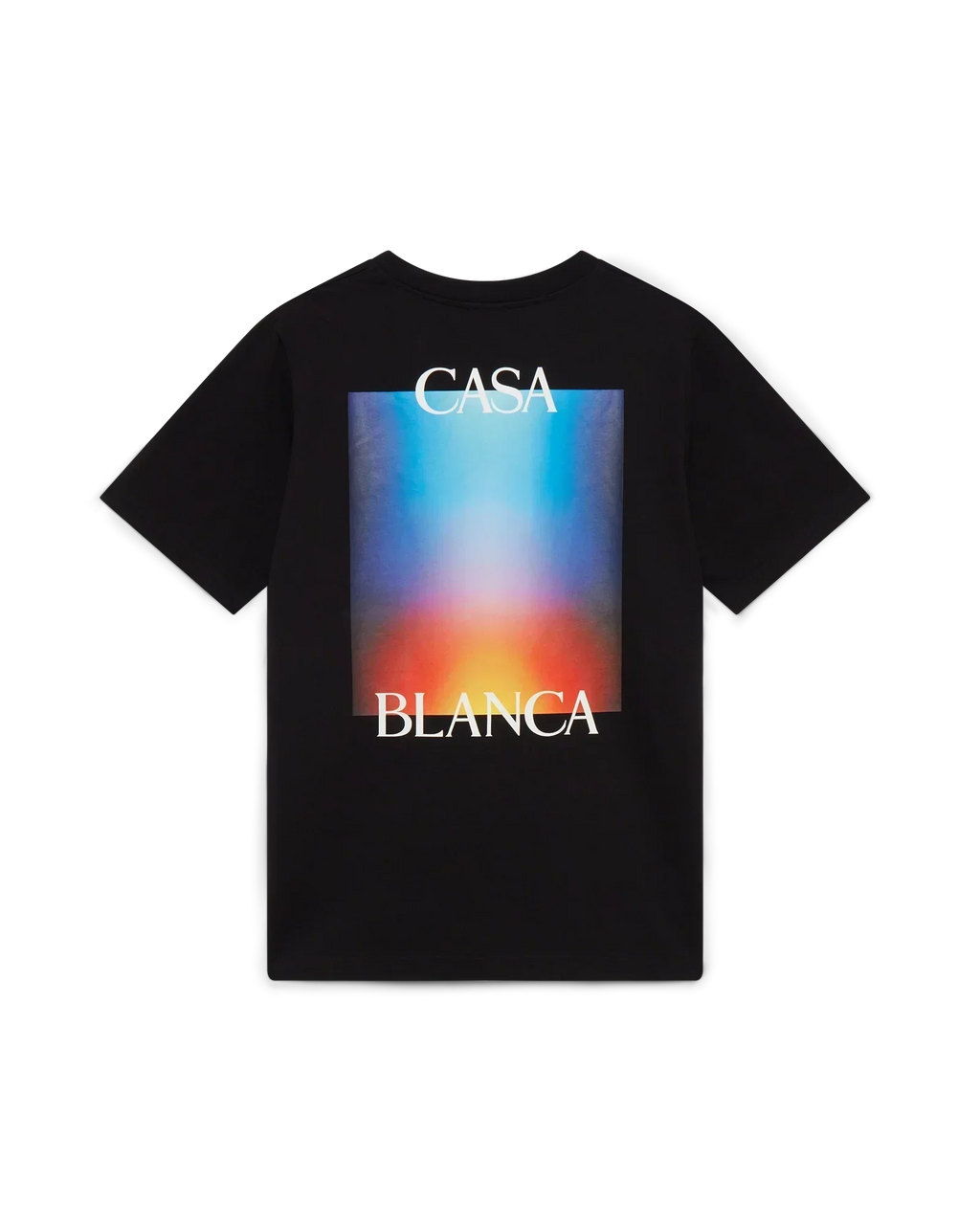 Le t-shirt Gradient Casa Logo est un modèle à manches courtes imprimé, conçu en coton bio, mettant en avant le dégradé de la saison inspiré par une interprétation futuriste du dégradé Casablanca : une forme d'aura inspirée des affiches et disques vintage de science-fiction. Il est complété par un col rond classique.