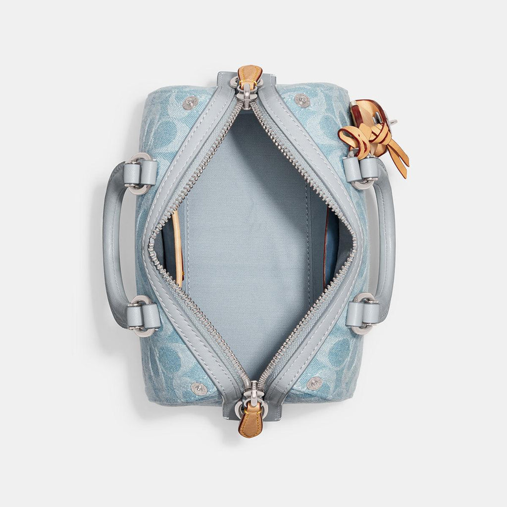 An unforgettable design, our Ruby satchel has an iconic rounded shape and an elongated zipper that opens wide for easy access to the interior. Crafted our laid-back light-wash Signature denim and buttery soft glovetanned leather, the compact style has multifunction pockets for great organization. Carry by the drop-down luggage handles or attach the comfortable wide crossbody strap for hands-free styling.