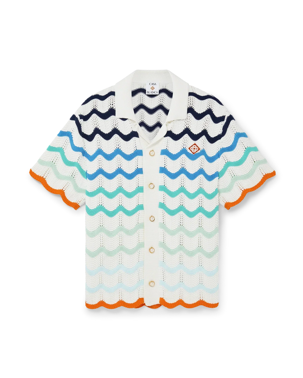 Cette chemise à manches courtes en crochet incarne parfaitement l’esprit voyage et détente de la capsule. Confectionnée en coton 100 % crocheté, elle présente un motif ondulé inspiré du style Memphis, décliné en dégradé de couleurs vibrantes.
