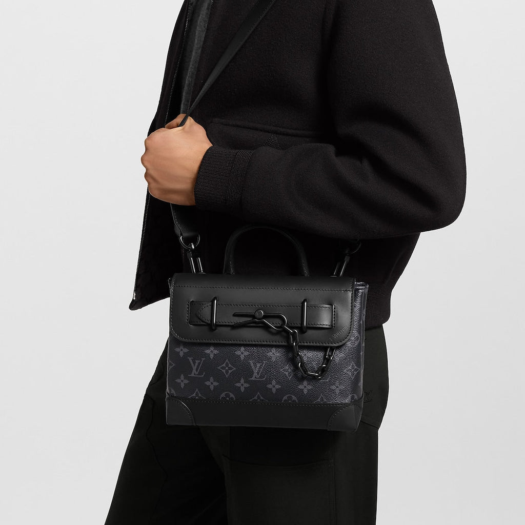 Ce nouveau sac Steamer PM combine avec créativité l'héritage de la Maison et un style contemporain décontracté. Réalisé en cuir de vache Taurillon souple embossé du motif Monogram dans un coloris noir classique, il est doté d'une chaîne signature et d'une boucle à épingle inspirées des bagages Steamer historiques de Louis Vuitton. Ce modèle spacieux à porter de multiples façons sublimera toutes les tenues actuelles.