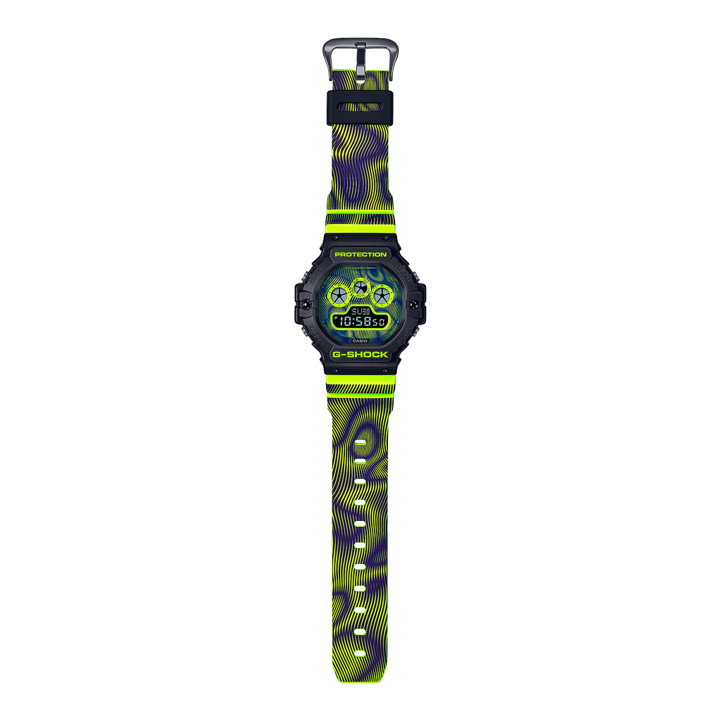 Le bracelet et le cadran sont imprimés de motifs qui déforment de manière ludique le temps et l'espace dans des couleurs fluorescentes vibrantes qui vous transportent dans le monde de la science-fiction.