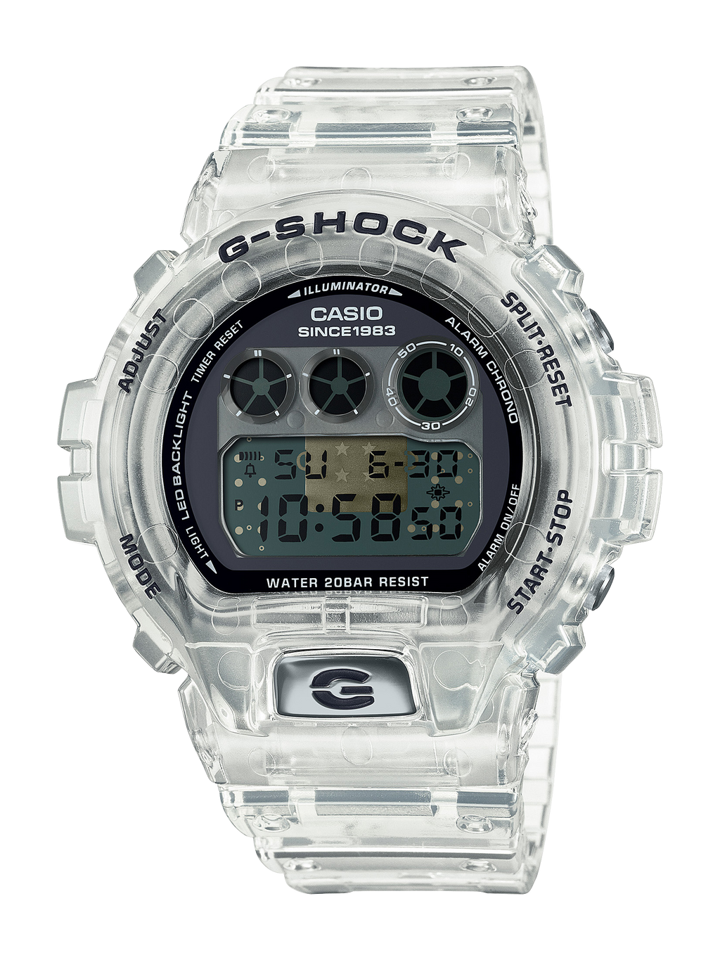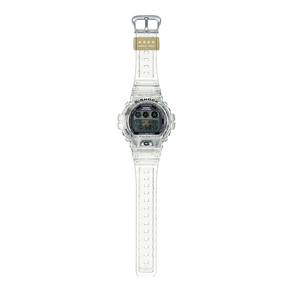 Les matériaux transparents pour le bracelet, le boîtier, le cadran, l'écran LCD et les boutons offrent une vue en coulisses du substrat du module imprimé avec la marque G et le logo G-SHOCK. Le fond du boîtier présente le 40e logo conçu par Eric Haze et le passant du bracelet est gravé de quatre étoiles en clin d'œil à cet anniversaire spécial. Ces détails et l'utilisation pour la première fois d'un boîtier transparent en diamide de fibre de verre transparent offrent un design singulier digne d'une G-SHOCK en édition limitée exceptionnelle.