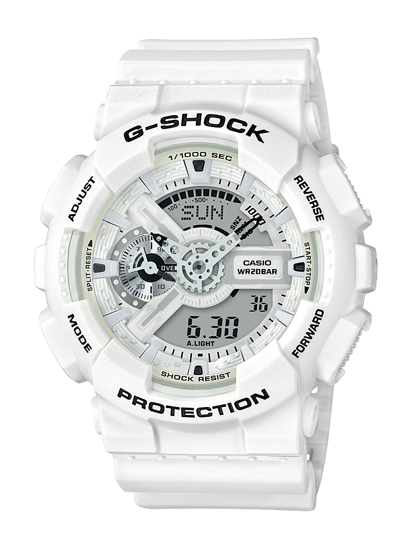 Le thème de couleur blanche du nouveau GA110MW-7A contribue à un design qui ajoute des accents frais au poignet pour un usage estival. La couleur blanche s'intègre parfaitement sur une plage ensoleillée et apporte un superbe accent aux modes estivales rafraîchissantes. Les accents noirs offrent un fort contraste avec le blanc et la résistance à l'eau à 200 m rend cette montre parfaite pour la plage.