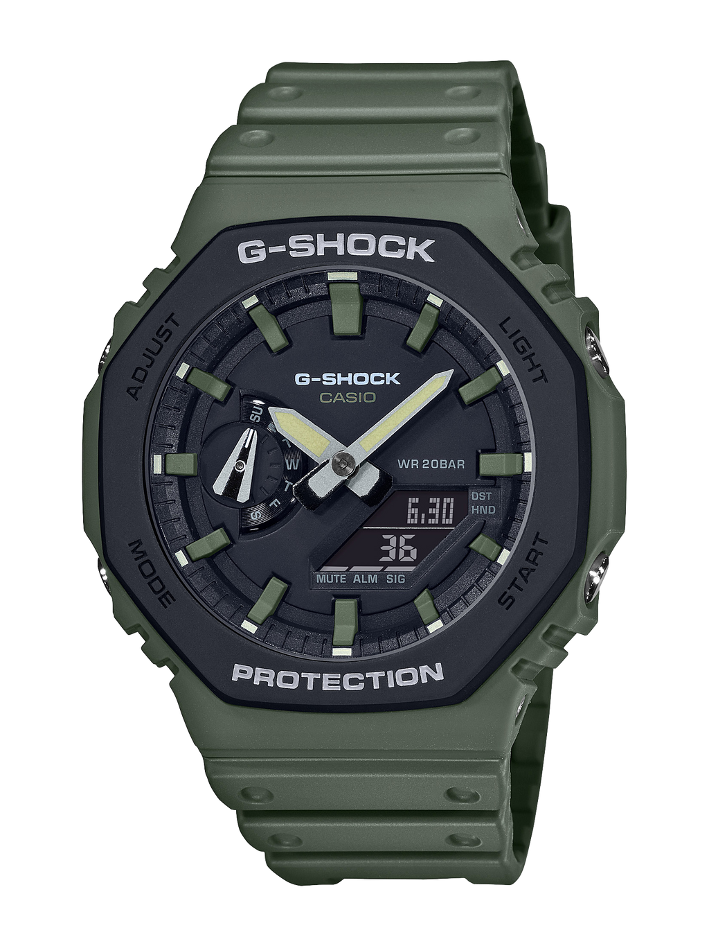 Ce nouveau modèle combine des couleurs pratiques et utilitaires des lunettes, des cadrans et des bracelets qui se marient bien avec la mode de la rue, pour créer des looks distinctifs qui s'intègrent parfaitement à un large éventail de modes et d'activités. Le motif de camouflage imprimé sur la lunette du modèle GA-2100SU crée de superbes nouveaux designs.