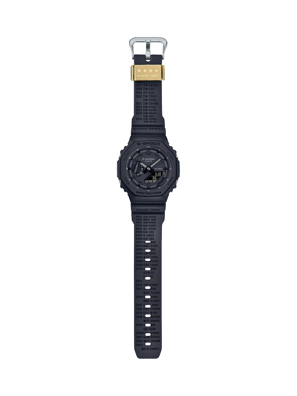 En hommage à l'évolution de la marque, ces designs spéciaux commémorent les modèles emblématiques du passé avec leurs noms estampés à chaud sur le bracelet pour un effet texturé et en retrait. Sur les DWE-5657, DW-6640 et GA-2140, un bouton latéral est gravé d'une étoile en clin d'œil au 40e anniversaire, tout comme le GA-114 avec une étoile imprimée sur le verre de la montre.