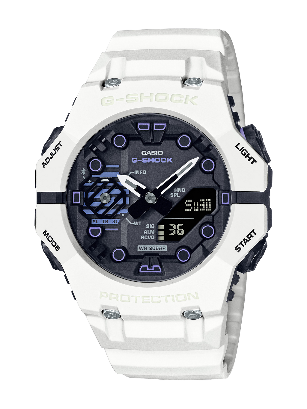 Inspiré des pages de science-fiction, le design blanc net et épuré est rehaussé de touches de bleu et de violet. La lunette est imprimée avec une peinture phosphorescente qui fait apparaître le logo G-SHOCK dans le noir.