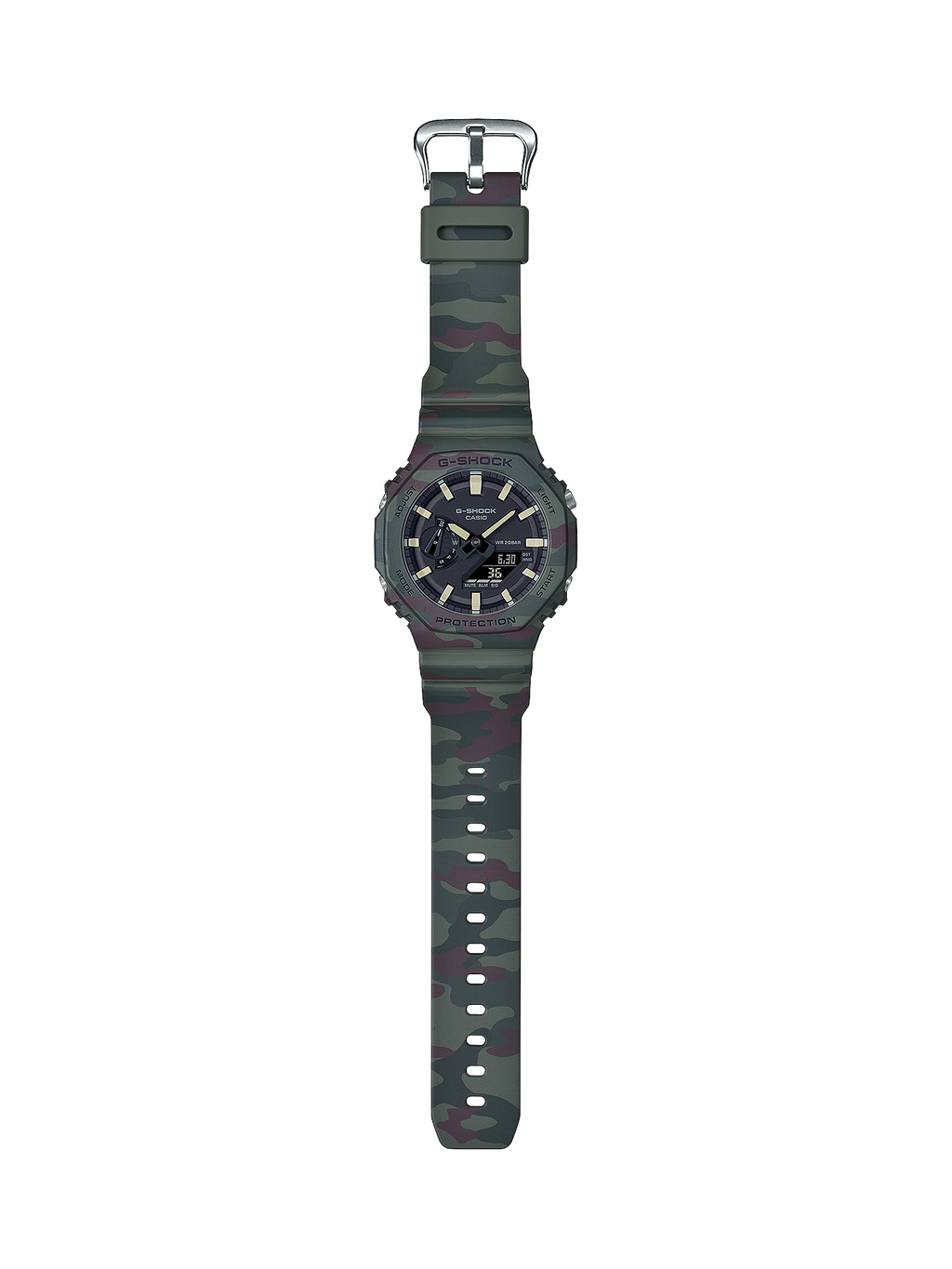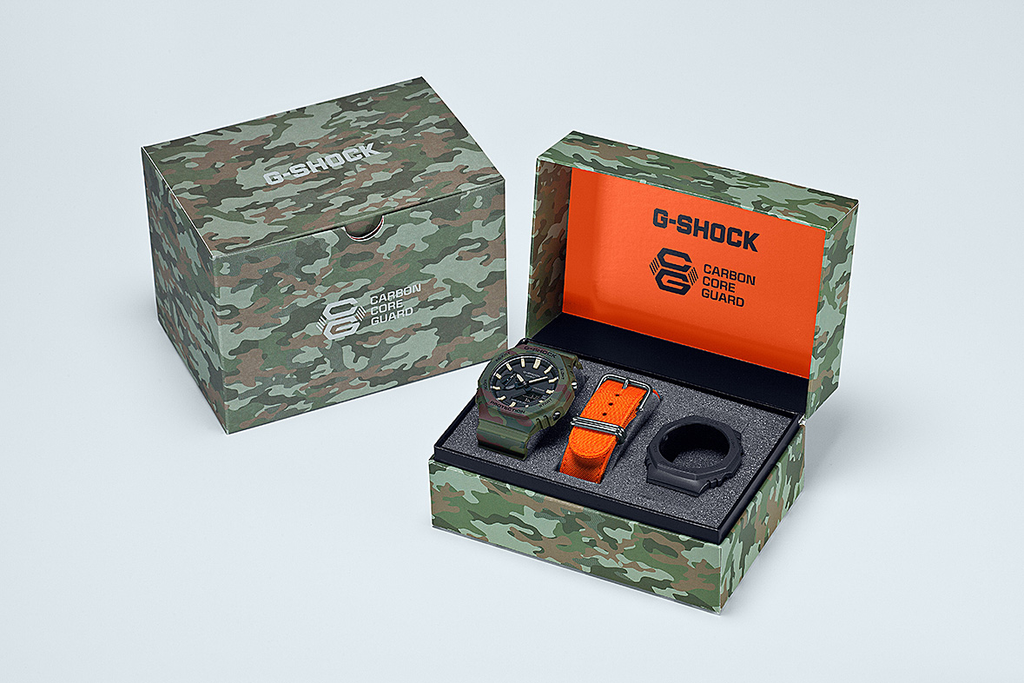 Basculez entre les bandes et les cadres interchangeables pour un GAE-2100 octogonal fin avec un esprit encore plus sauvage. Le camouflage vert inspiré de la nature et l'orange vif de la mode plein air vous emmènent des rues urbaines à la mode à l'exploration de la nature sauvage dans un style cool et décontracté.