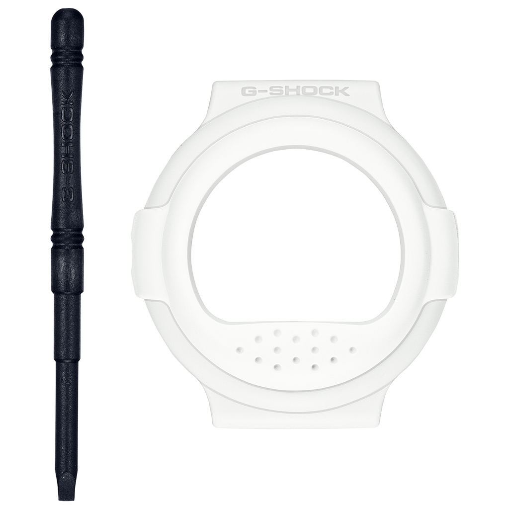 Inspiré des pages de science-fiction, le design blanc net et épuré est rehaussé de touches de bleu et de violet. La lunette est imprimée avec une peinture phosphorescente qui fait apparaître le logo G-SHOCK dans le noir.