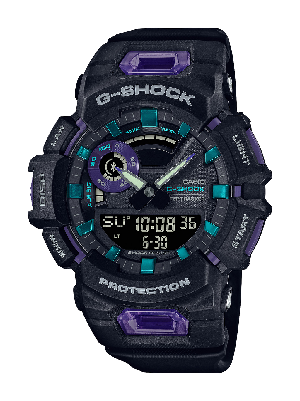 L'éclairage du visage Super Illuminator permet de lire facilement les informations du visage, même dans l'obscurité. Le matériau en uréthane souple du bracelet améliore l'ajustement au poignet et les trous d'aération améliorent la respirabilité. Cette montre se connecte à votre téléphone via Bluetooth® pour prendre en charge le réglage automatique de l'heure, les notifications téléphoniques, le suivi des pas et d'autres fonctions tout au long de la journée. La durée de vie de la batterie est d'environ deux ans entre les remplacements.