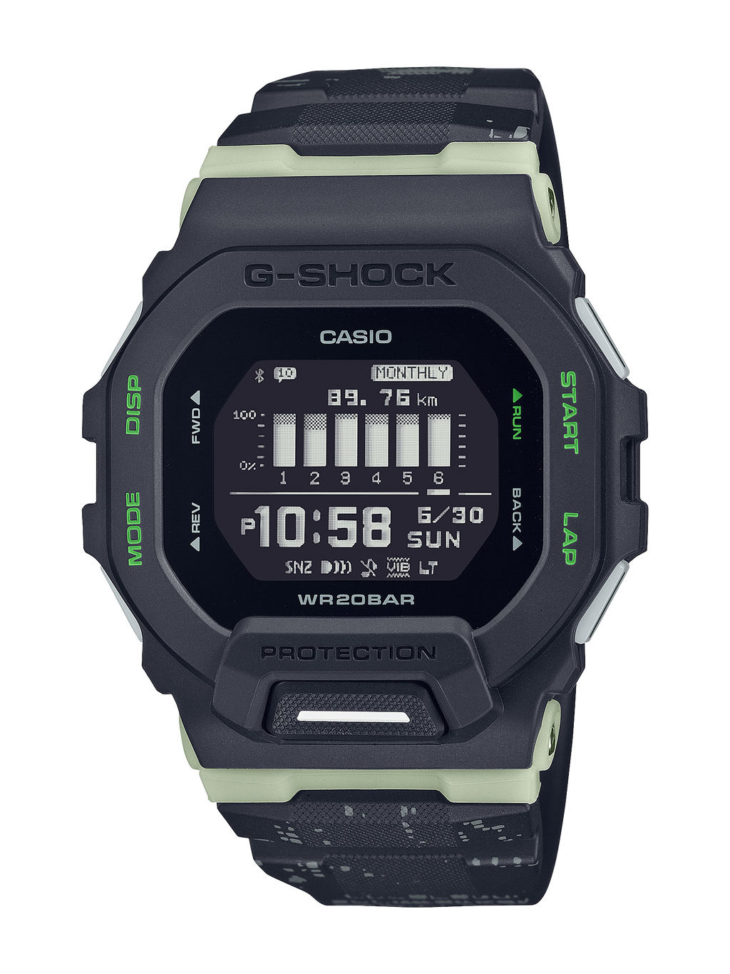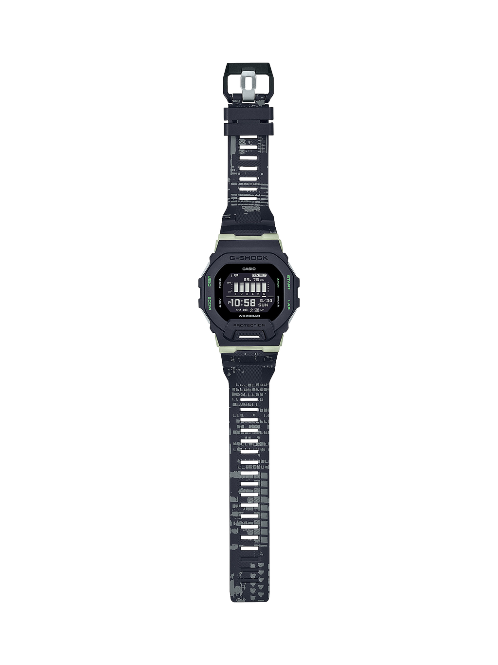 Le GBD-200LM est doté d'une résine qui brille dans le noir à l'endroit où la lunette et le bracelet se rencontrent, pour briller avec assurance dans les espaces non éclairés. Avec une bande à motif camouflage luminescente inspirée des paysages nocturnes urbains, ce design audacieux ne peut pas se tromper, de jour comme de nuit.