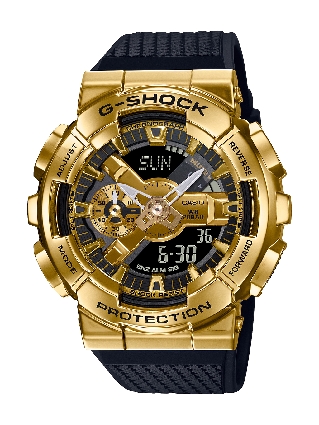 La lunette en acier inoxydable de ce modèle analogique-numérique de la série GM-110 a été forgée, découpée et polie pour lui donner son design distinctif.