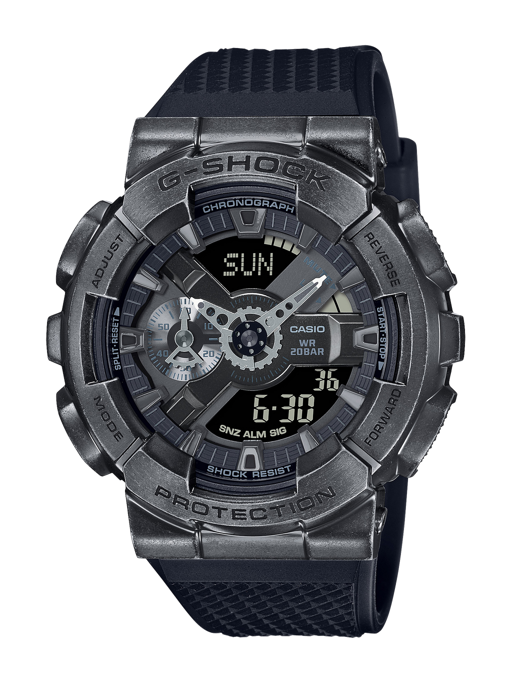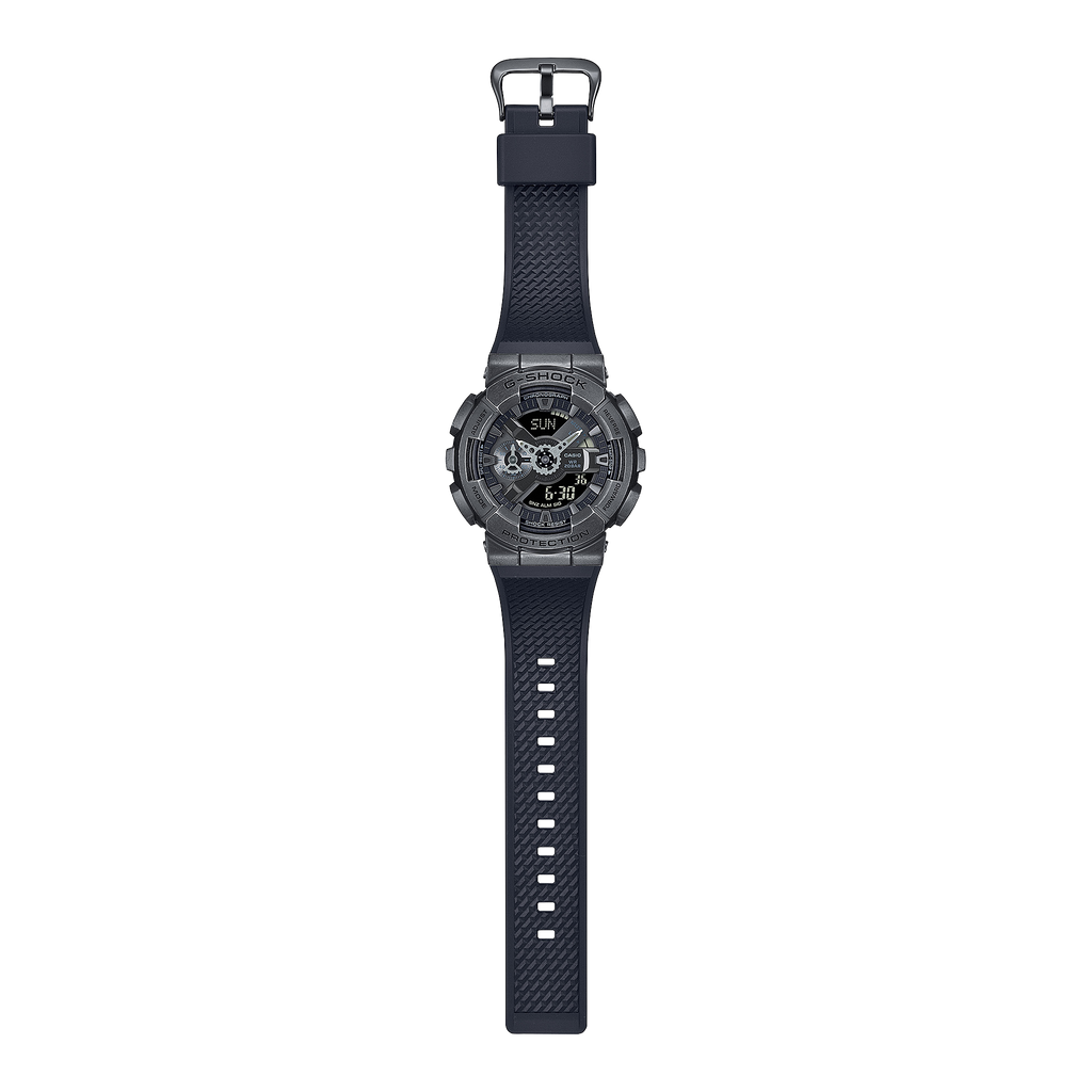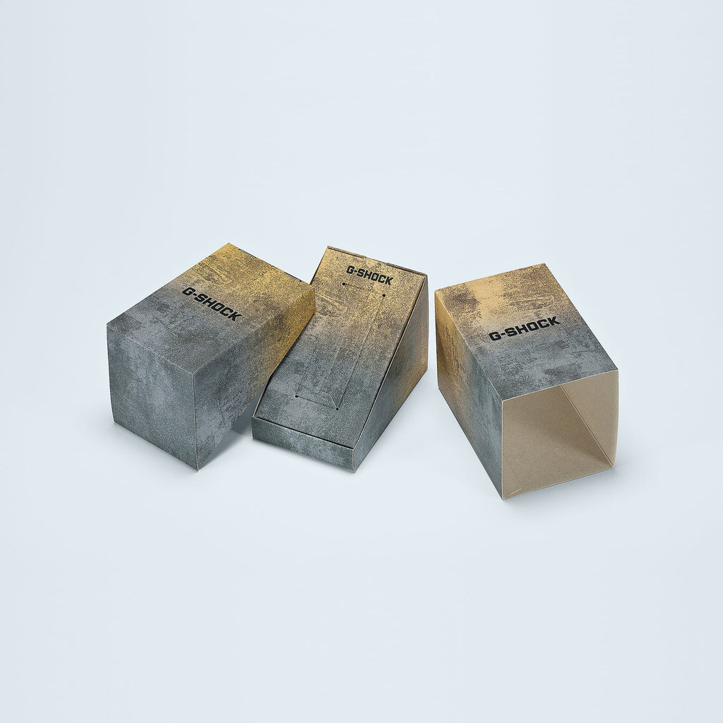 Pour donner au grand boîtier métallique du GM-110 l'apparence et la sensation du laiton usé, la lunette du GM-110VB est traitée avec un IP vieilli en noir, tandis que le GM-110VG est fini avec un IP vieilli en or. Les aiguilles des heures et des minutes en forme d'engrenages de machines ajoutent une touche mécanique au design robuste.