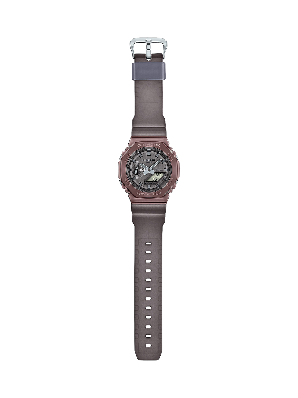 Les composants métalliques sont polis et finis par placage ionique de couleur pour une sensation mate riche, tandis que le bracelet et le boîtier portent des tons de couleurs complémentaires pour ajouter une touche de contraste équilibré. Des bandes translucides dans des tons neutres et discrets s'estompent jusqu'à devenir presque incolores, évoquant la qualité éthérée d'un brouillard nocturne.