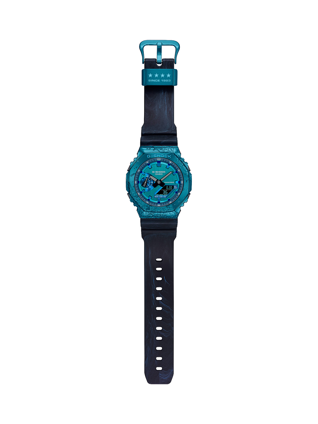 Ces garde-temps en édition limitée célèbrent entièrement le 40e anniversaire du G-SHOCK : la phrase « SINCE 1983 » apparaît sur le cadran ; le 40e logo conçu par Eric Haze est gravé sur le fond du boîtier et il y a quatre étoiles pour 40 sur le passant du bracelet.