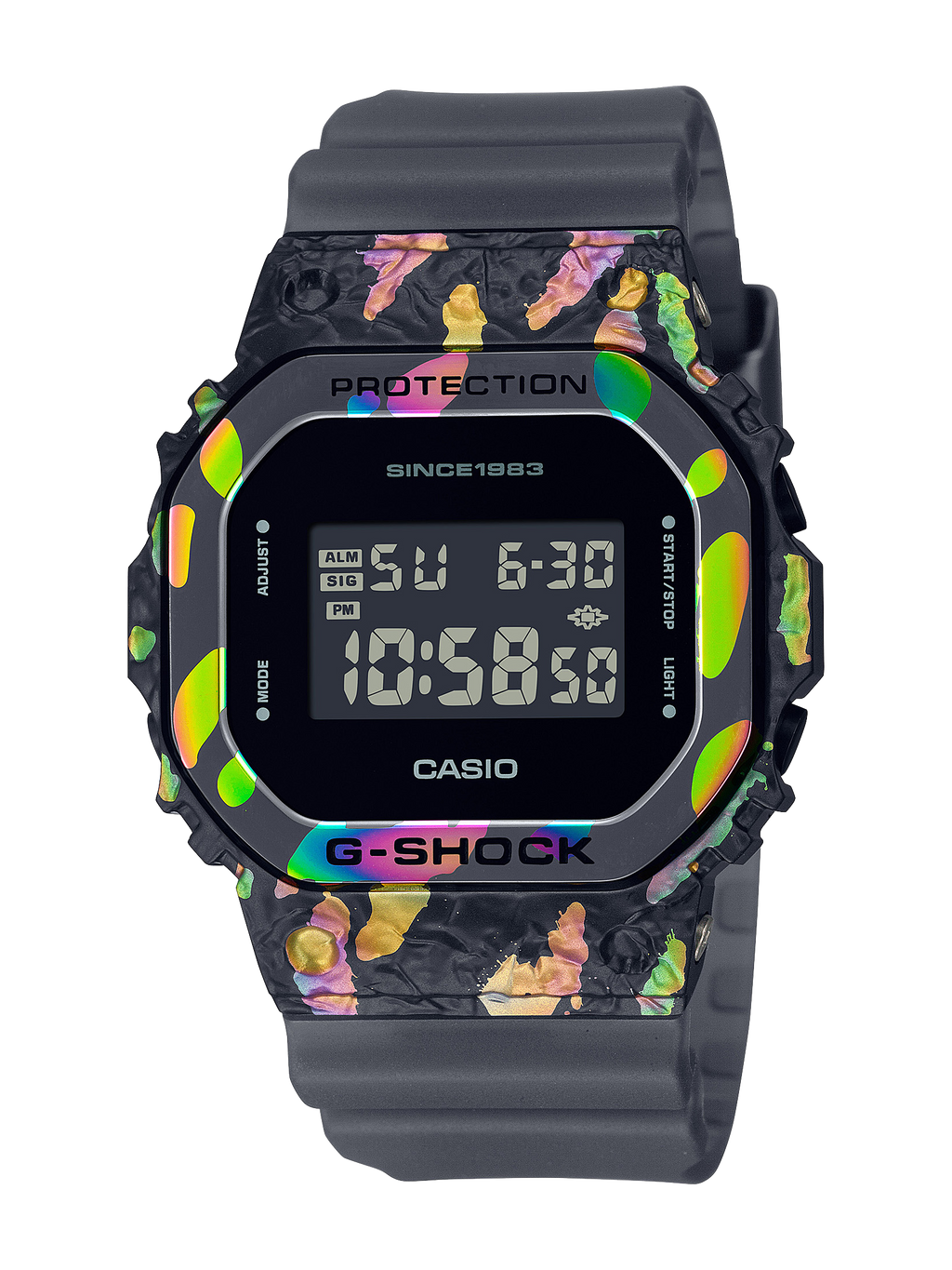 Ces garde-temps en édition limitée célèbrent entièrement le 40e anniversaire du G-SHOCK : la phrase « SINCE 1983 » apparaît sur le cadran ; le 40e logo conçu par Eric Haze est gravé sur le fond du boîtier et il y a quatre étoiles pour 40 sur le passant du bracelet.
