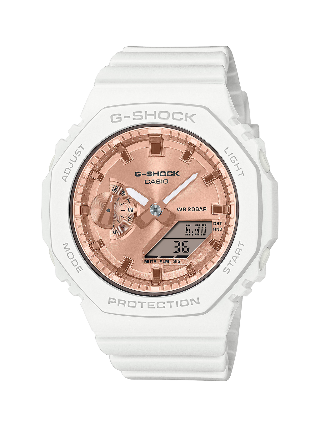 Ces montres GMA-S2100 sont dotées d'un cadran plat fini en dépôt de vapeur d'or rose et de simples index à barres pour un look simple, minimaliste mais étincelant.