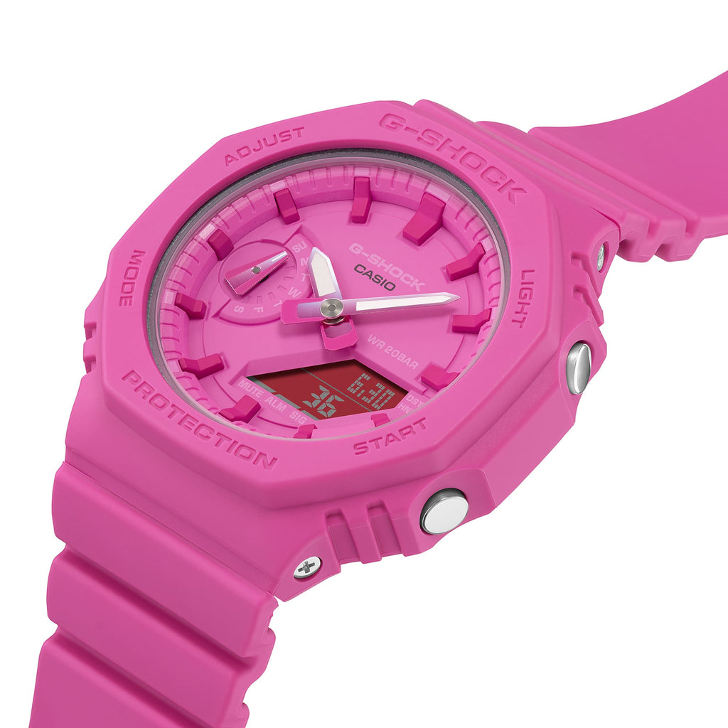 Cette version audacieuse du populaire GA-2100 analogique numérique et de son plus petit compagnon, le GMA-S2100, commence par des couleurs dynamiques et vives et ajoute des boutons et une boucle dans une finition métallique pour une texture améliorée.