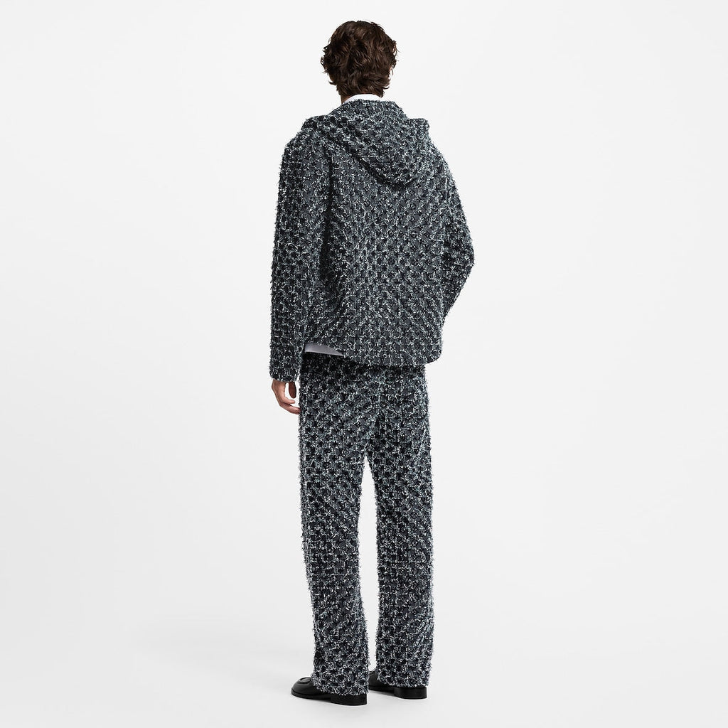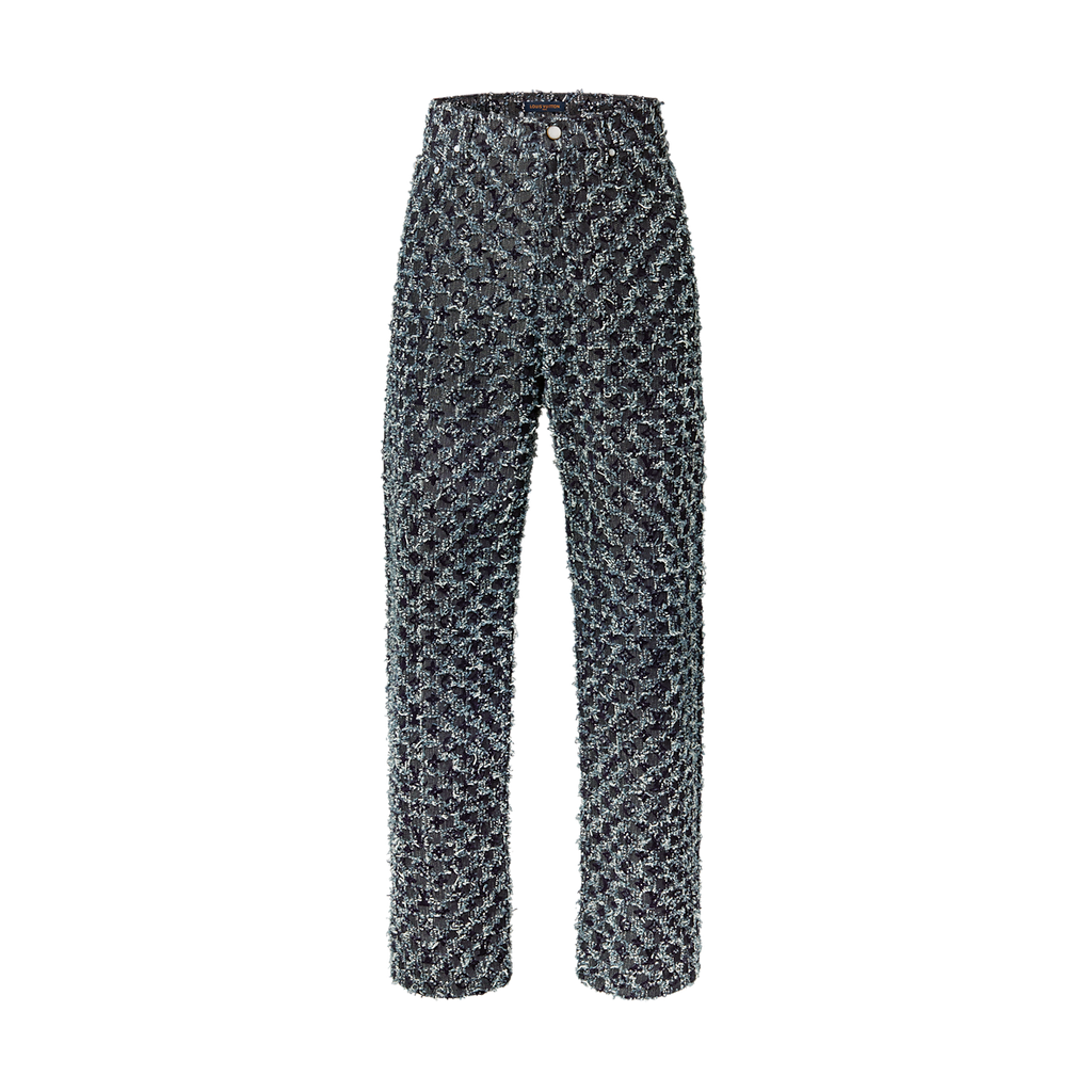 Ce pantalon droit sophistiqué est une pièce décontractée classique revisitée avec le savoir-faire Louis Vuitton. Le denim indigo présente une finition Damier texturée effet tweed, ornée d'un motif Monogram en velours floqué. Un jacqueron Damier en nubuck et des rivets effet perle lui prêtent une note de raffinement. Ce modèle s’associe à un sweat à capuche assorti.
