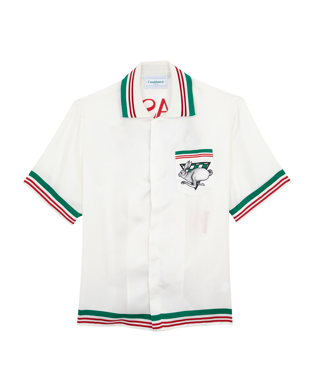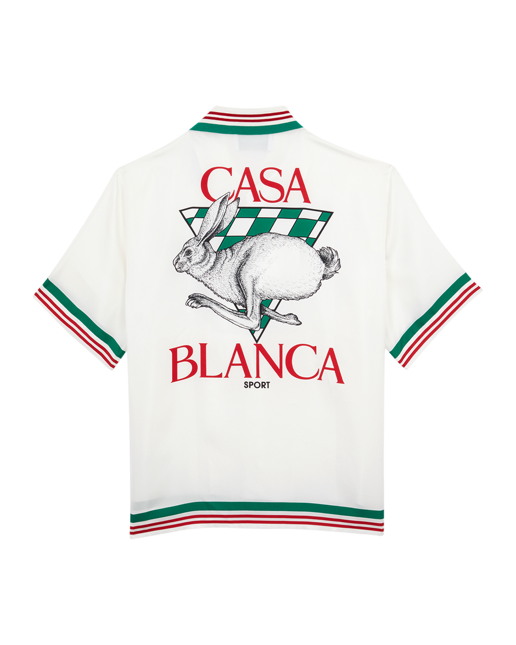 Casa Sport Knit Collar Short Sleeve Silk Shirt, features our seasonal Rabbit icon upon a green and white chequered triangle on both the front pocket and a larger back print; a tribute to speed and sport of F1 racing. With contrast knitted trims on the collar, hemline and sleeves in green and red colour stripes, another nod to the sport of racing.
