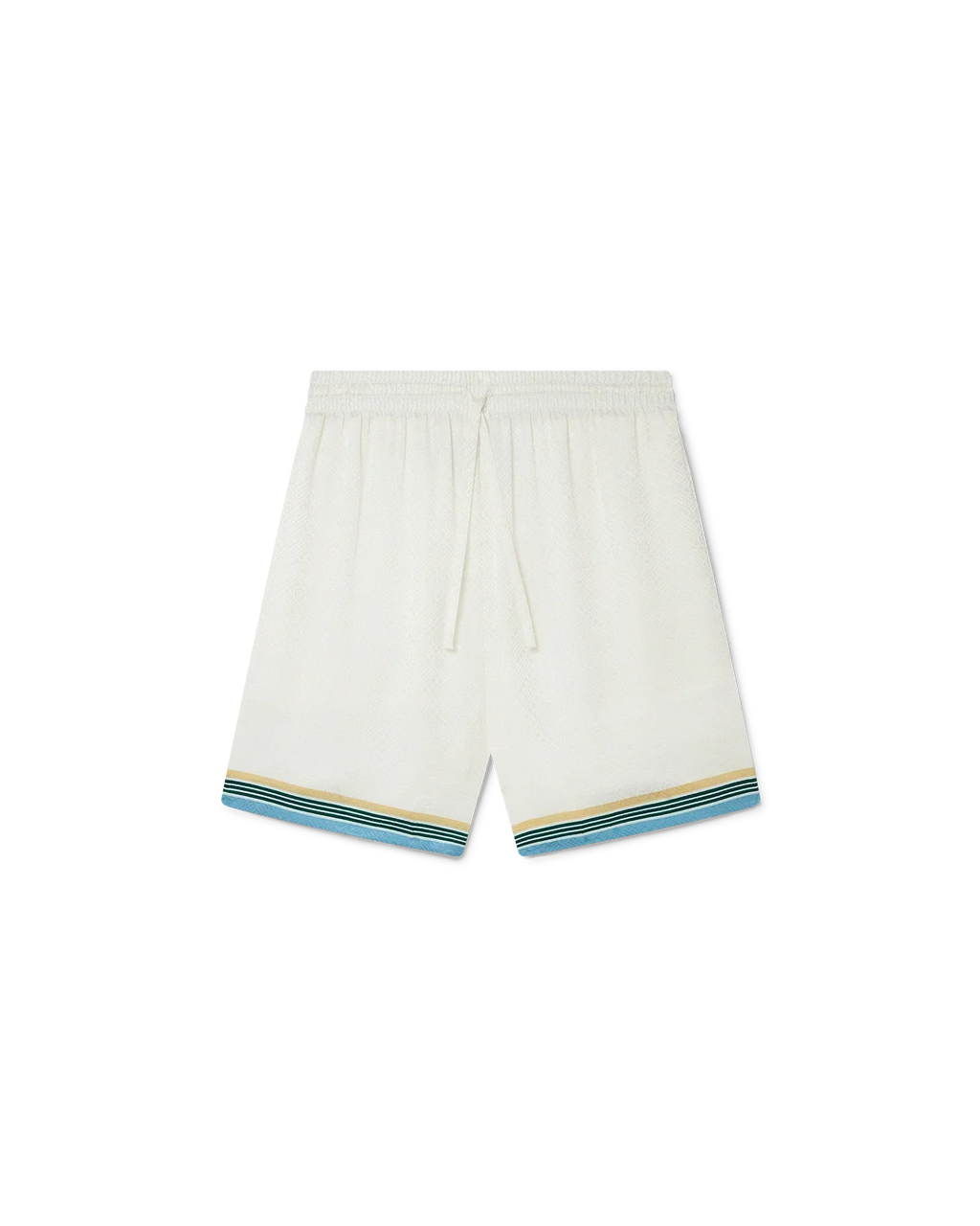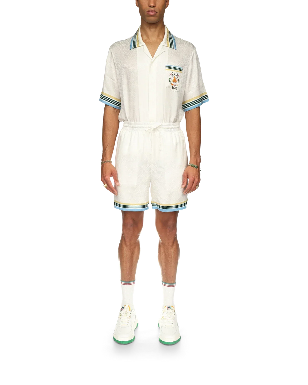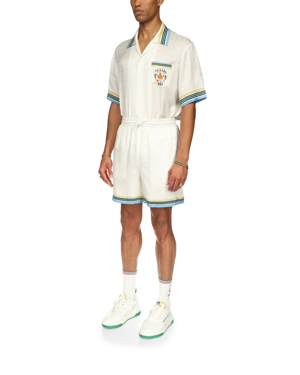 Les shorts en soie Casa Way sont confectionnés dans un tissu en soie et présentent l'artwork iconographique de la maison sur la poche arrière. Ils sont finis avec des poches latérales, une taille élastiquée, un cordon de serrage, et un détail contrasté rayé autour de l'ourlet et de la poche arrière.