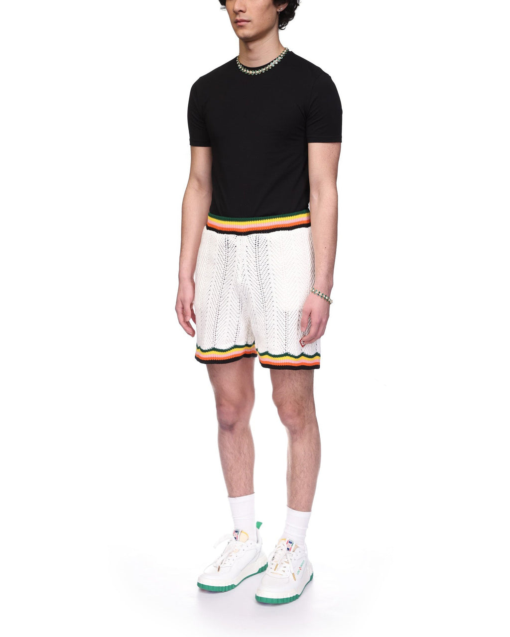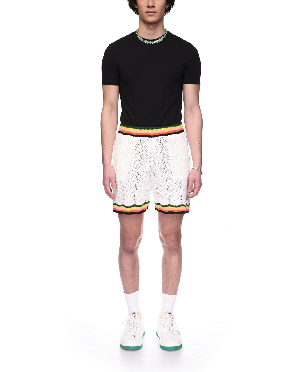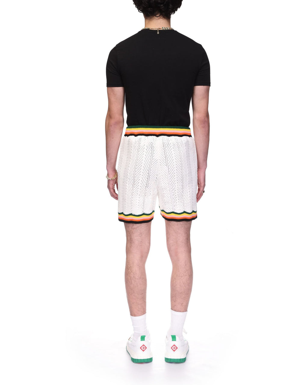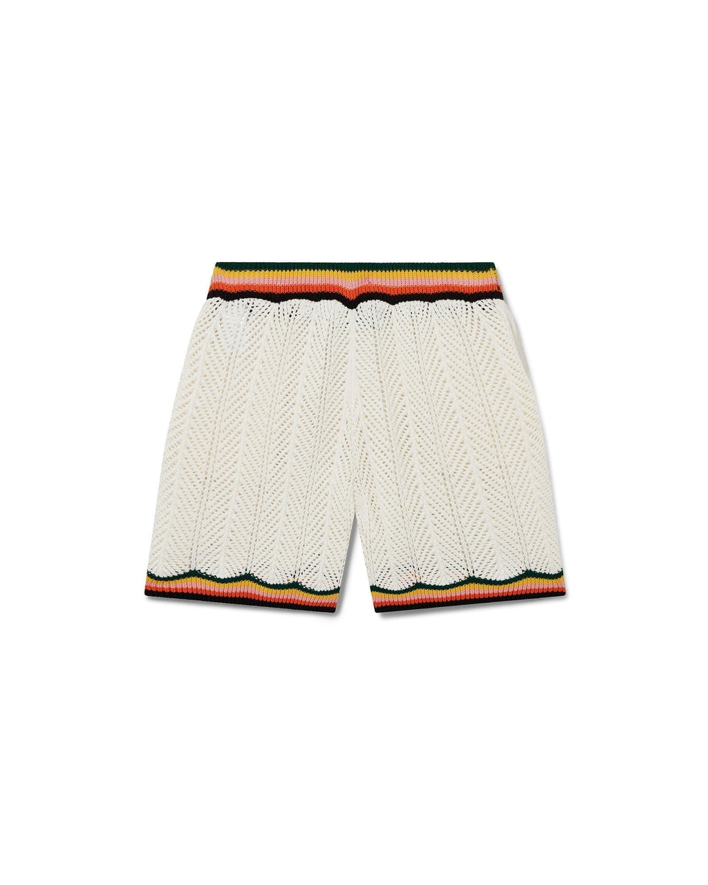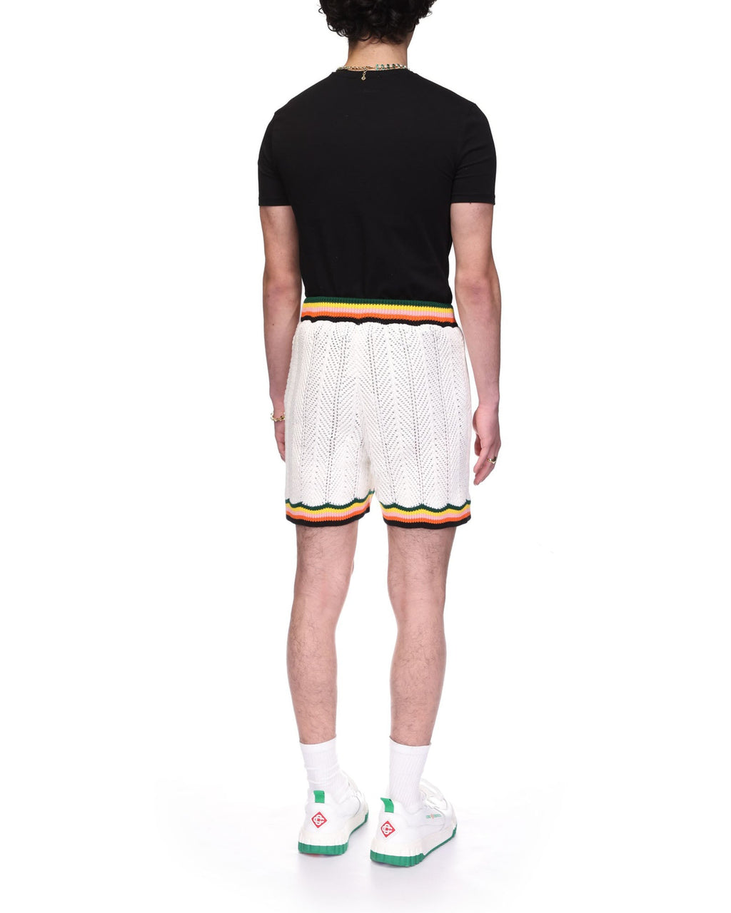 Ce short en dentelle à chevrons est confectionné en tissu de coton tricoté et arbore le logo en diamant emblématique de la maison. Complet avec un motif à chevrons contrasté autour de la taille et de l'ourlet côtelés avec les couleurs de la saison, des poches latérales et une fermeture par cordon de serrage interne.