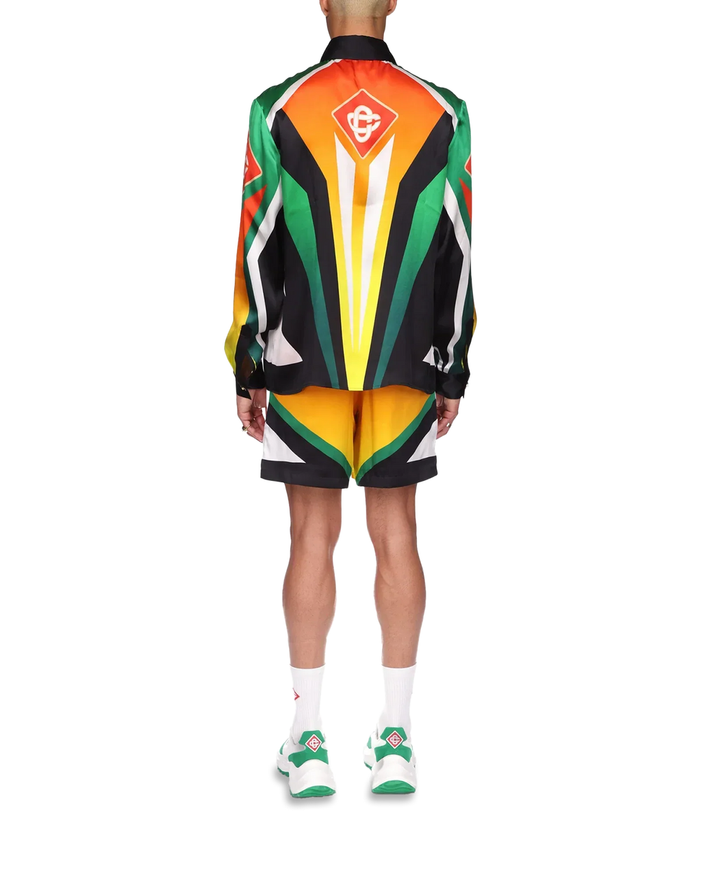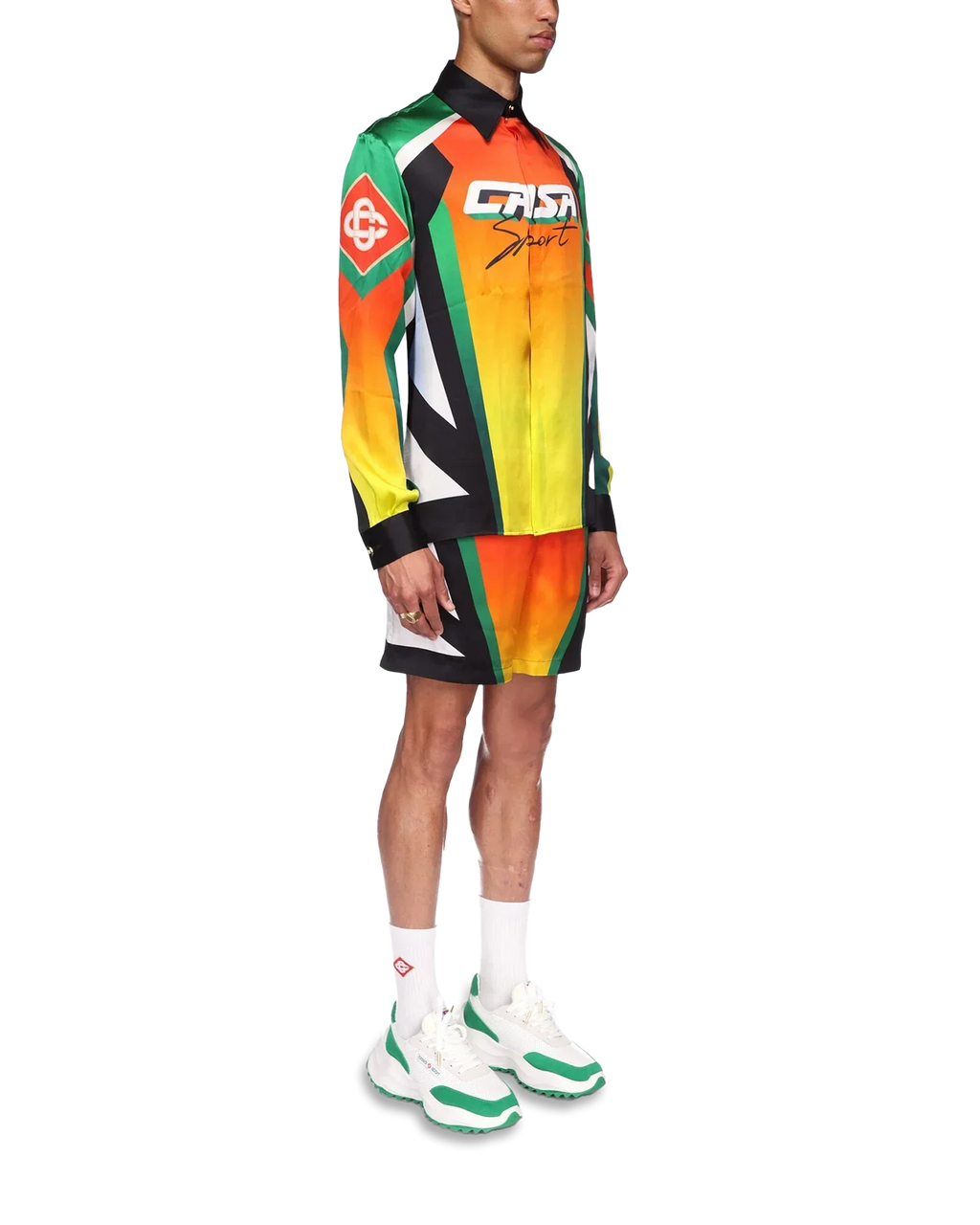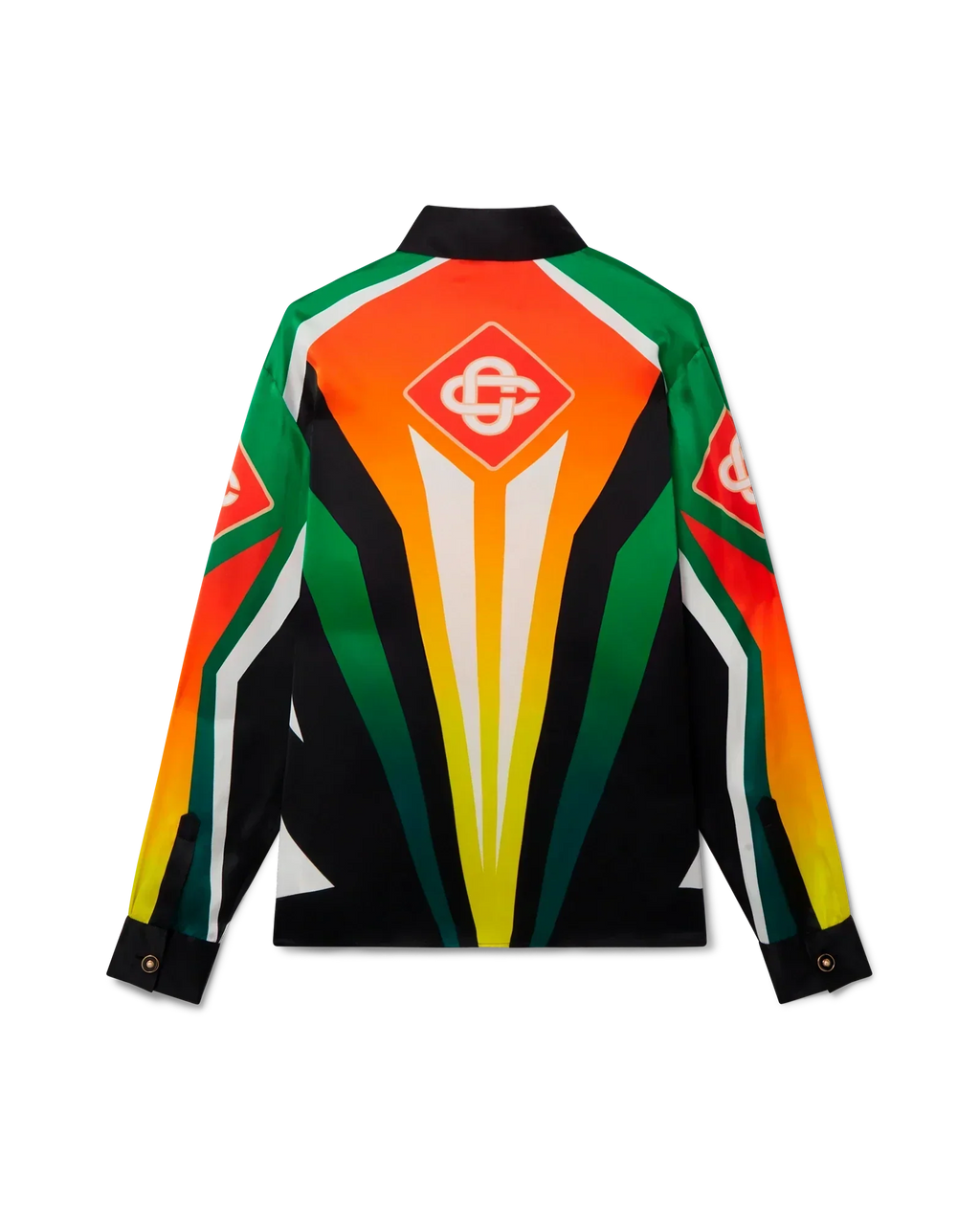 The Casa Moto Sport silk shirt is a long-sleeve printed style, crafted from a silk satin fabric, featuring panels of this season's gradient colours representing the rich exchanges across cultural disciplines in African art, music and film. Completed with the house's signature gold rim enamel buttons, button closure, black contrast point collar and cuffs.