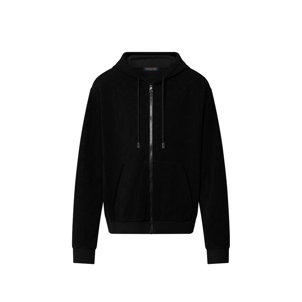 Idéal pour se détendre après la plage, ce sweatshirt à capuche noir à fermeture à glissière en French Terry doux allie confort et raffinement. Le tissu éponge en coton mélangé se distingue par un motif Monogram ton sur ton estampé. Cette pièce peut se porter avec le short assorti.